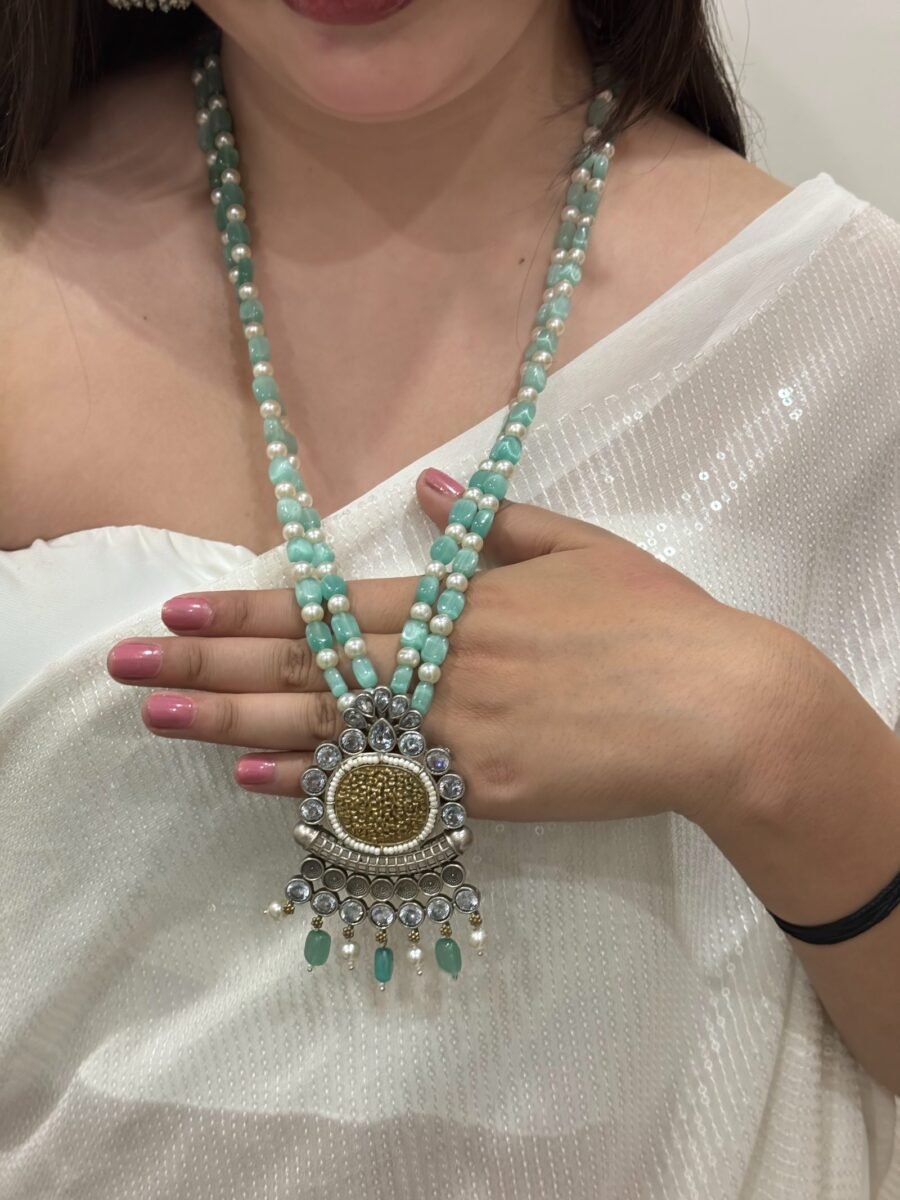 Exquisite Turquoise Beaded Necklace Set with Antique Pendant & Jhumka Earrings