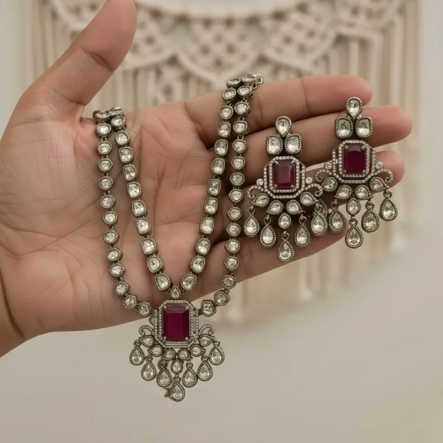 Moissanite Polki Studded Double Layer Ruby Necklace Set
