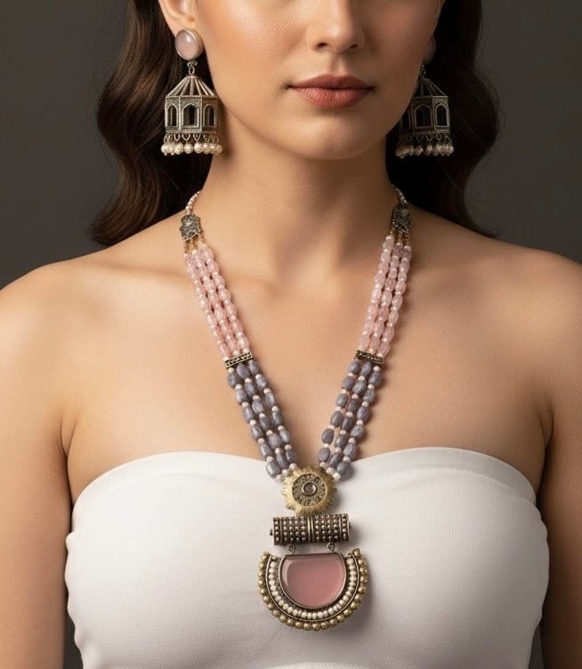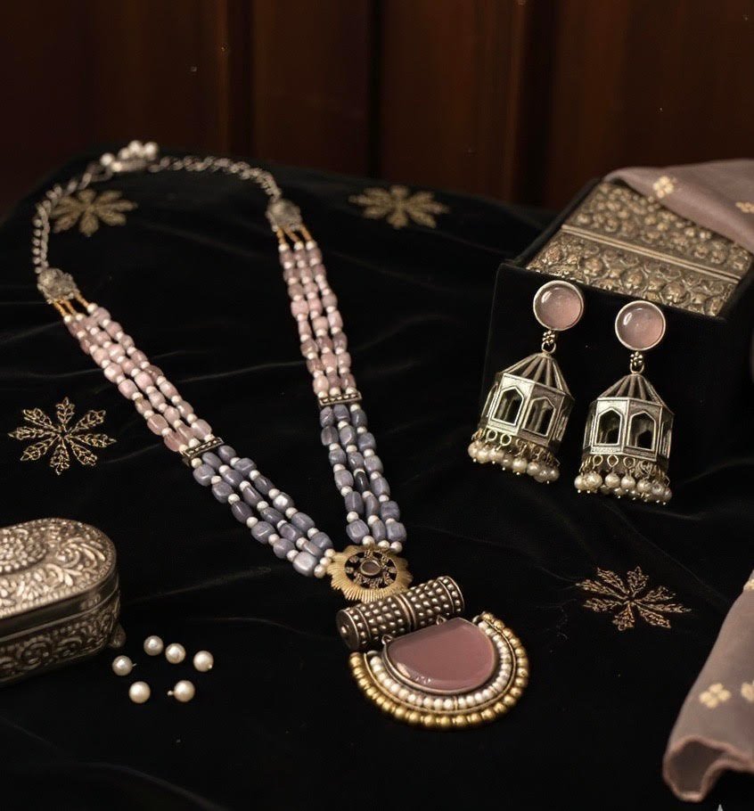 Regal Dual-Tone Beaded Necklace Set with Statement Jhumkas – A Timeless Fusion of Elegance
