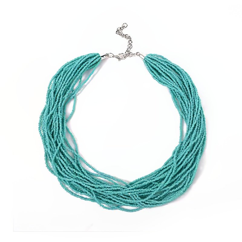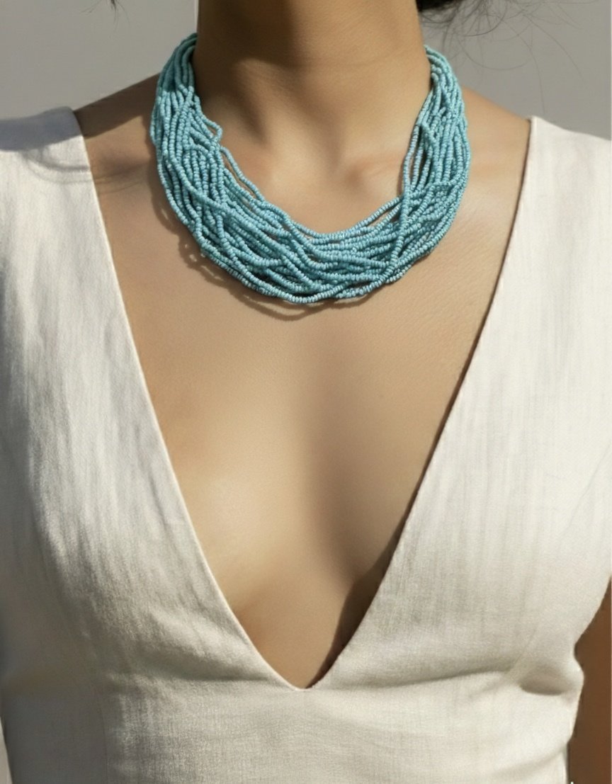 Twisted Turquoise Beaded Necklace – Multi-Strand Layered Elegance with Adjustable Silver Clasp