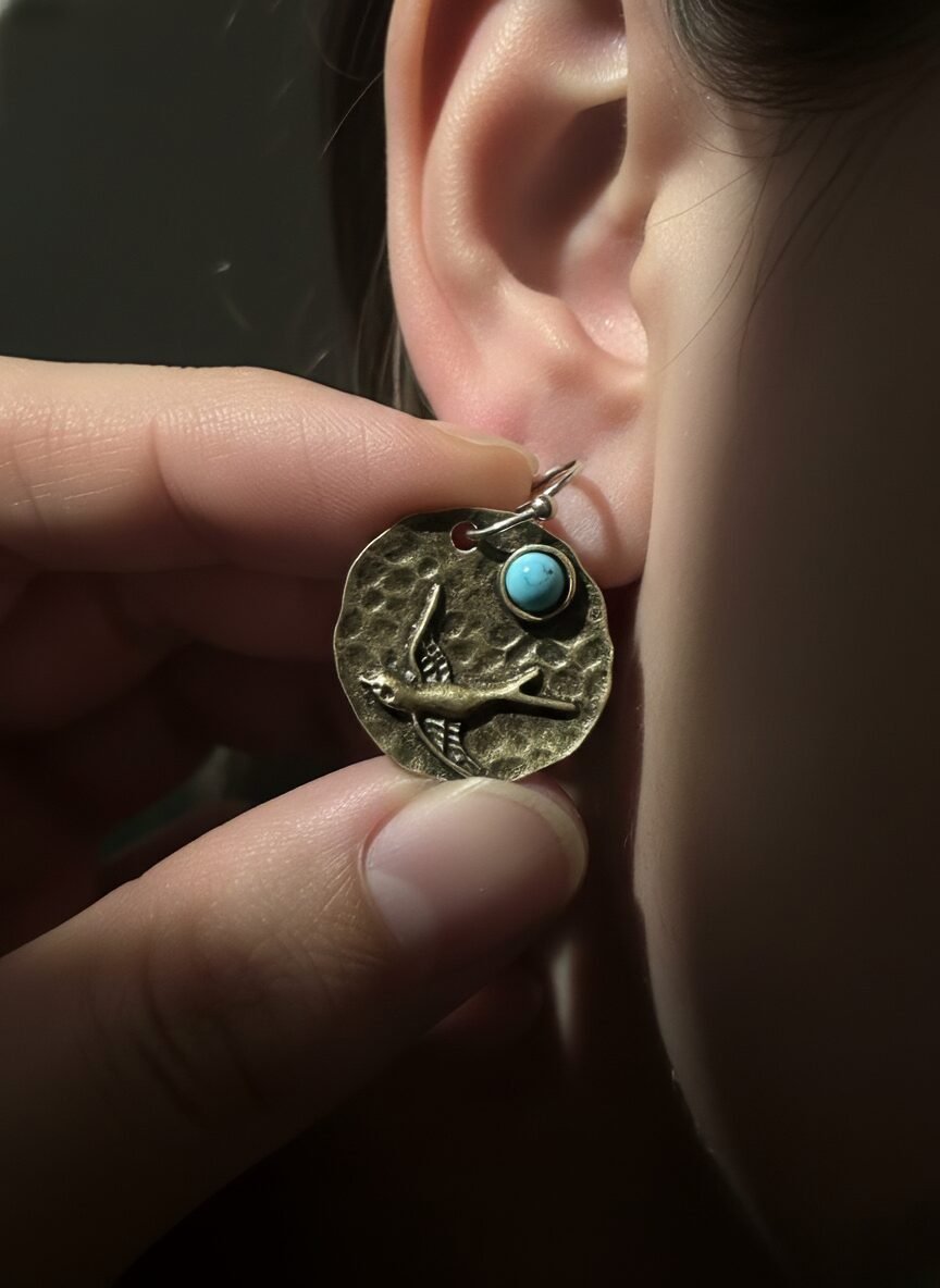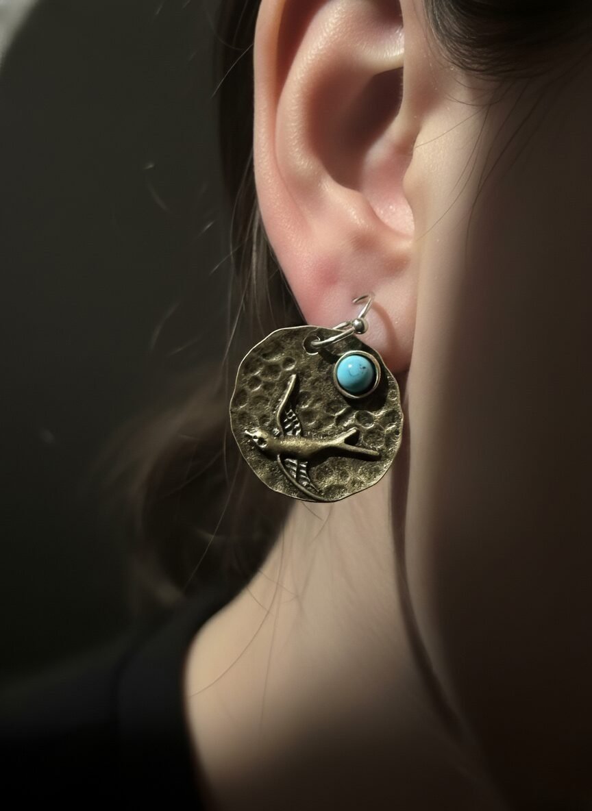 Vintage Brass Bird Medallion Earring with Turquoise Accent