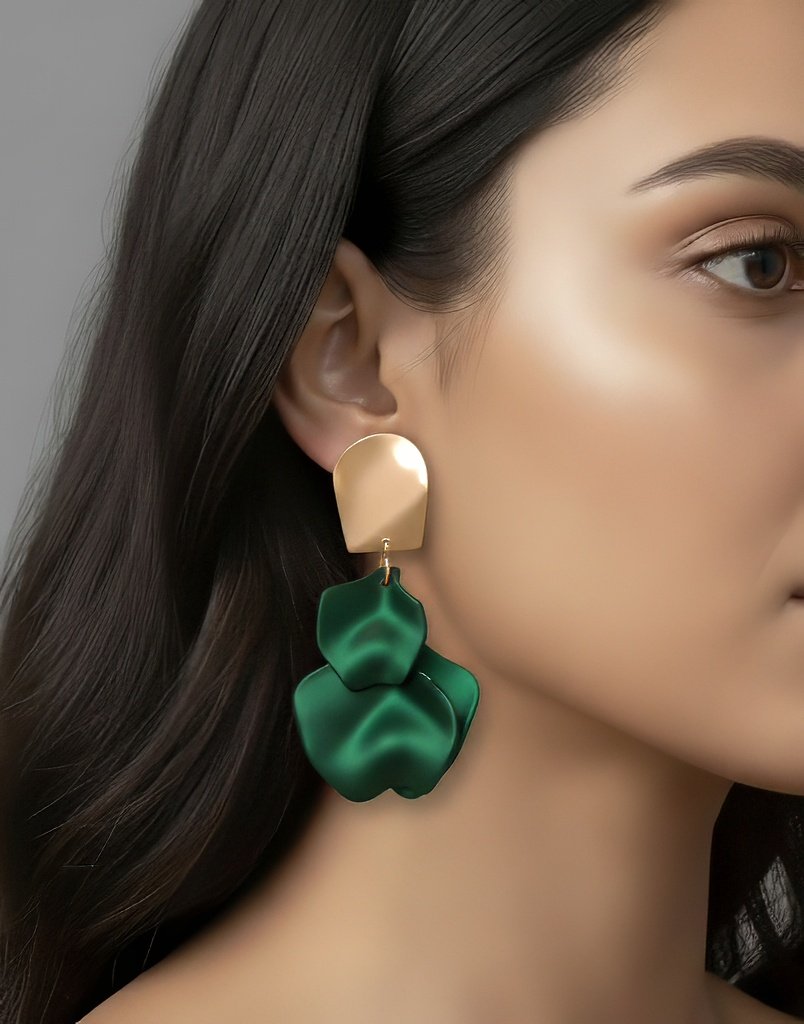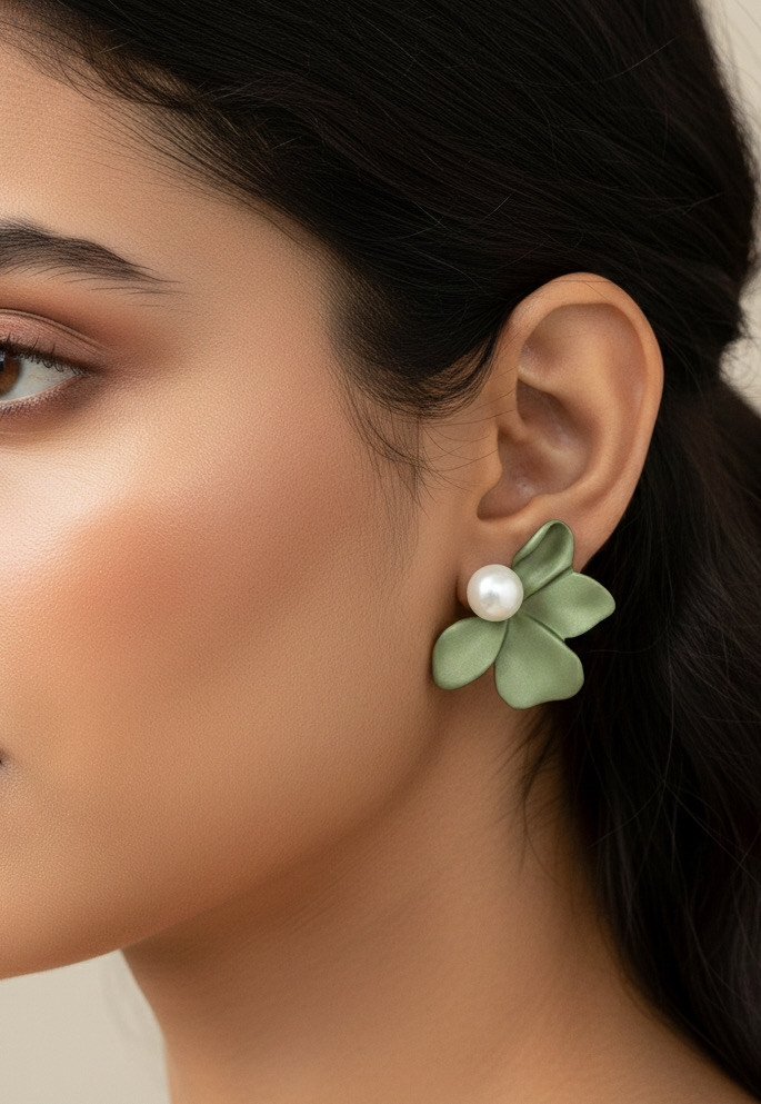 Matte Green Floral Stud Earring – Pearl-Centered Petal Charm
