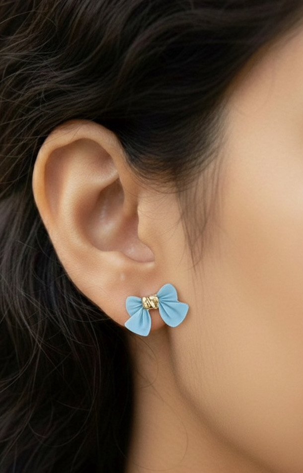 Pastel Blue Bow Stud Earring – Feminine Charm with Gold Accent