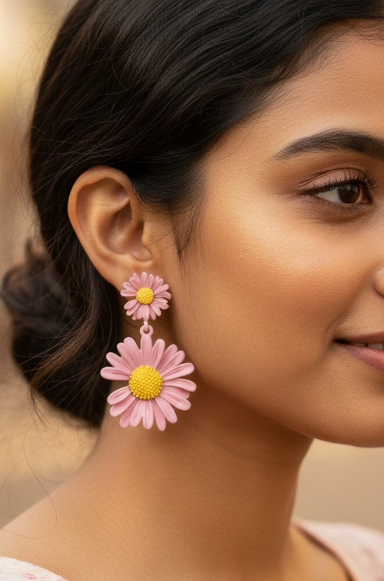 Pink Daisy Drop Earrings on a Warm-Toned Profile