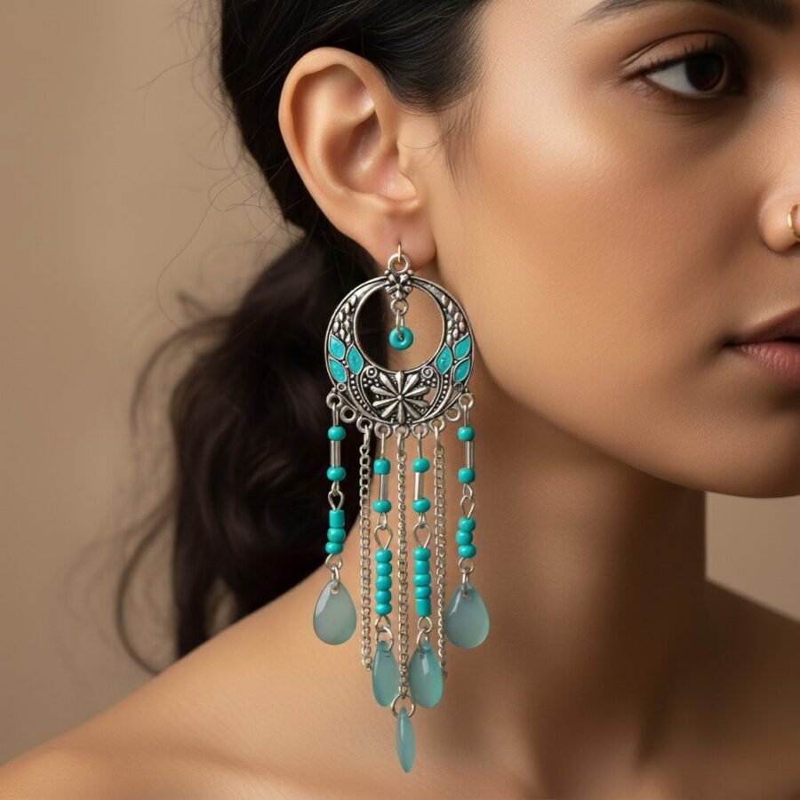 Turquoise Crescent Chandbali – Ethnic Elegance with Feathered Drops