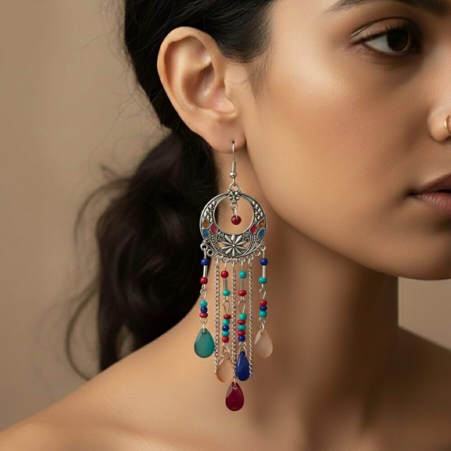 Boho Crescent Drop Earrings – Multicolor Bead Cascade