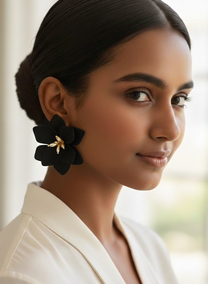 Black Floral Statement Earrings with Gold-Tone Center