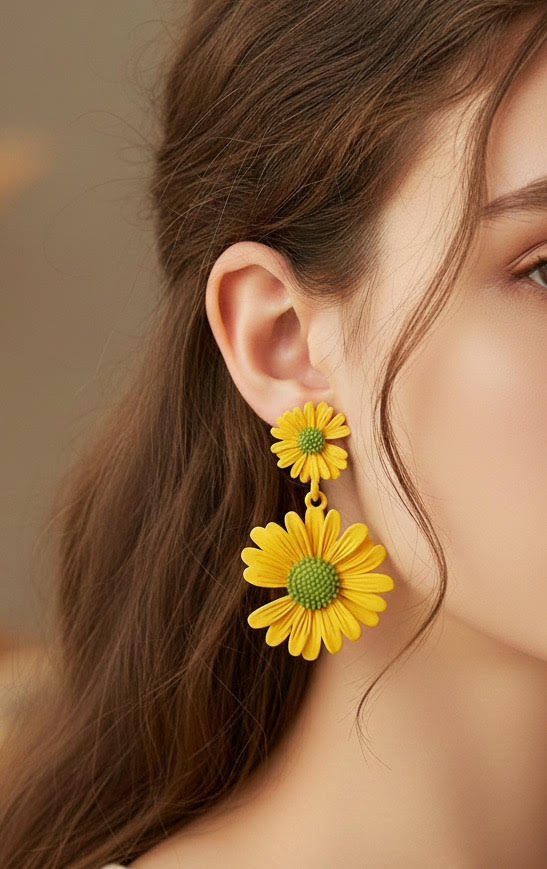 Yellow Daisy Drop Earrings with Green Centers