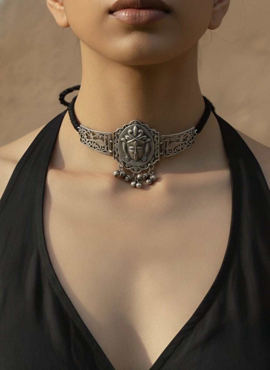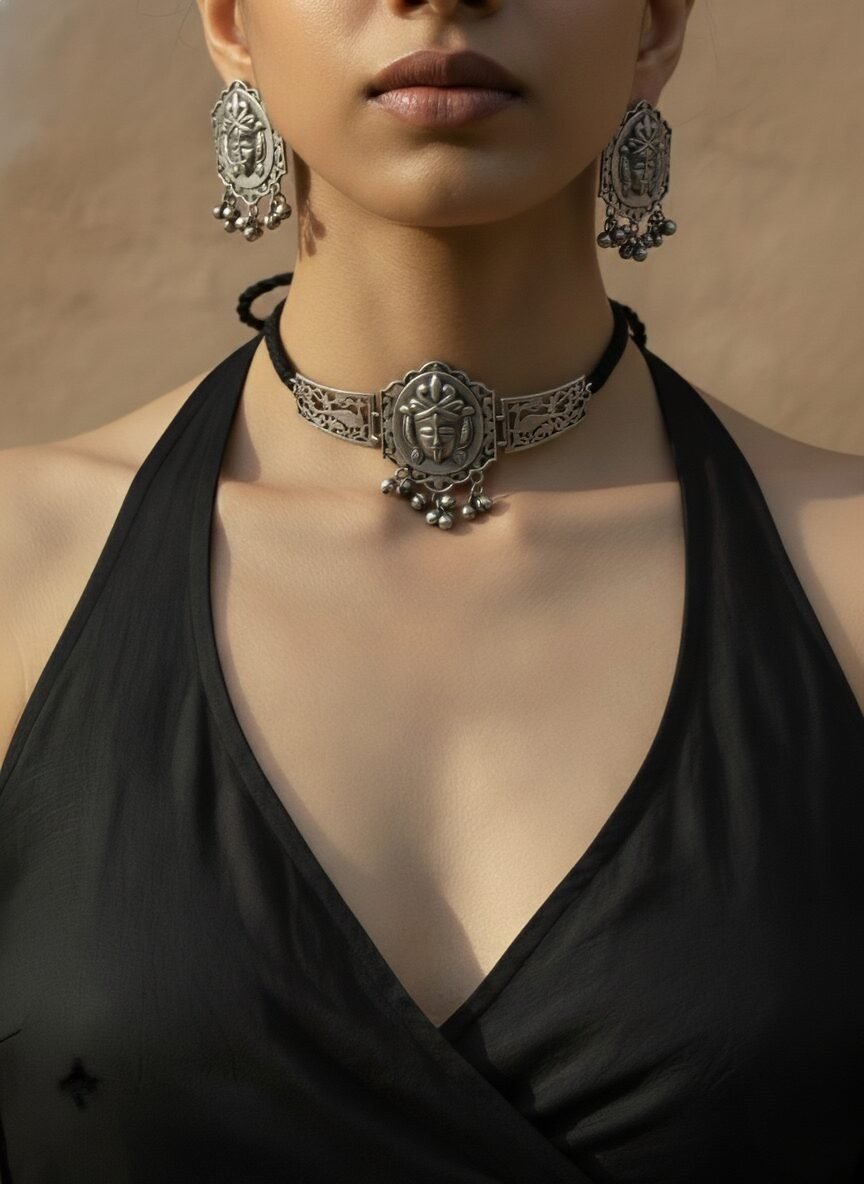 Silver Choker Necklace Set with Carved Face Motif & Bead Detailing