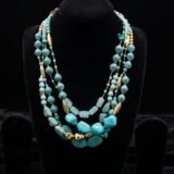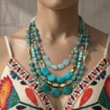 A symphony of color and texture, this multi-strand necklace is crafted from an exquisite mix of turquoise beads in varying shapes, sizes, and shades—from serene seafoam to bold cerulean. Each strand is thoughtfully arranged to create a cascading effect across the collarbone, offering depth and movement with every turn.