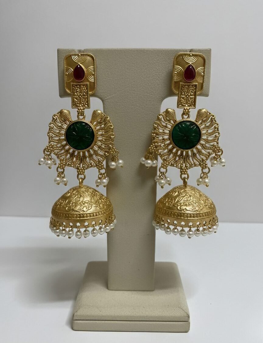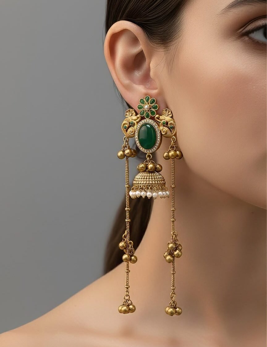 Gold Jhumka Earrings with Green Gemstone & Pearl Fringe