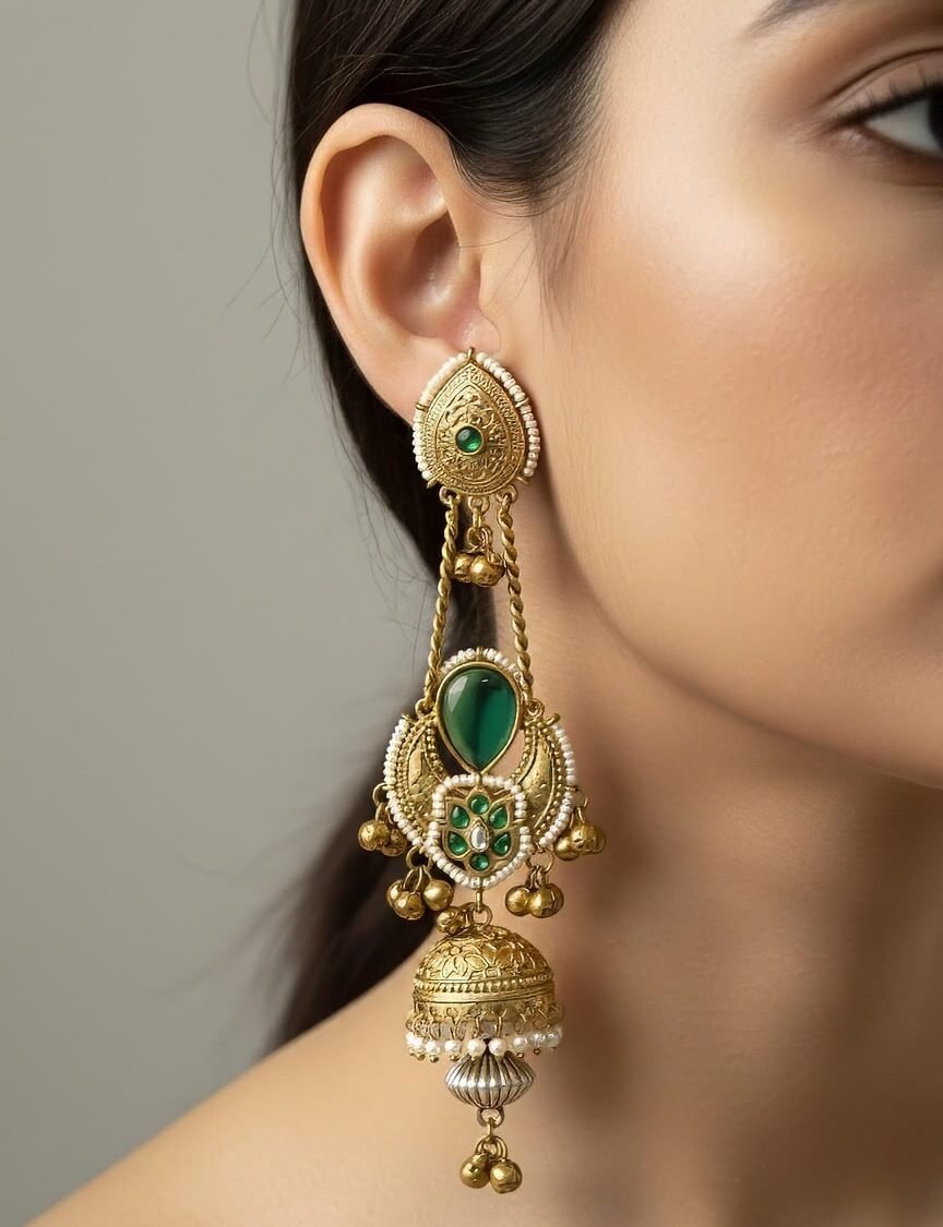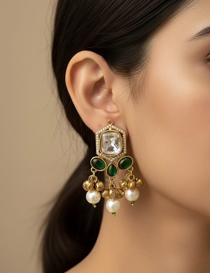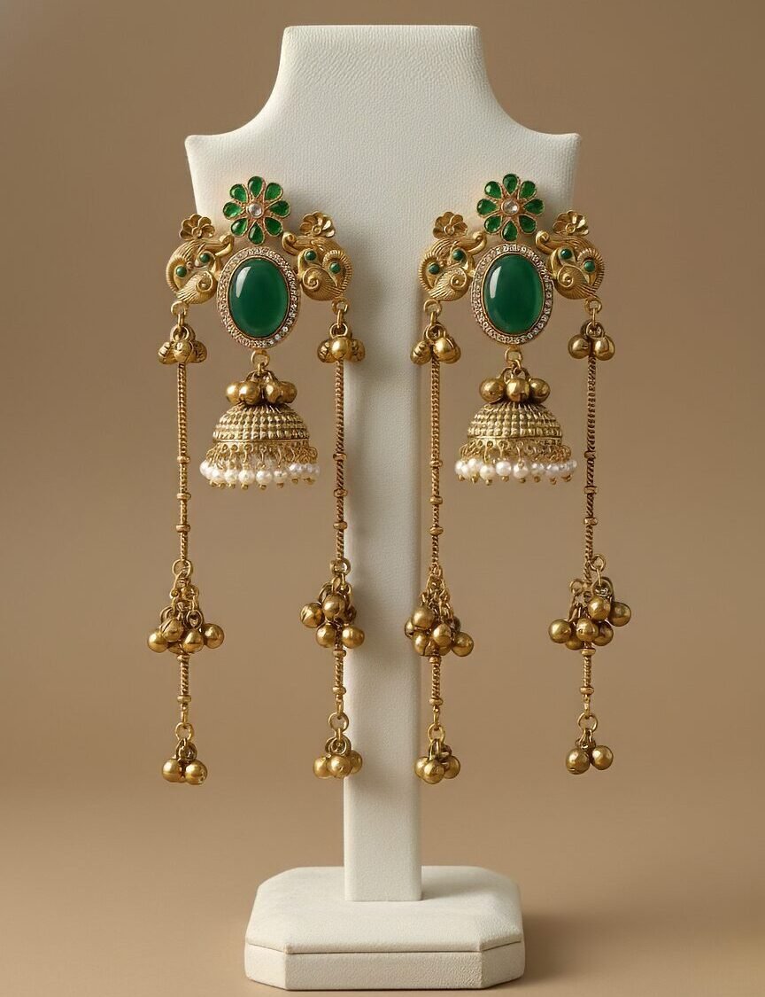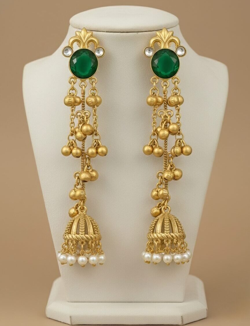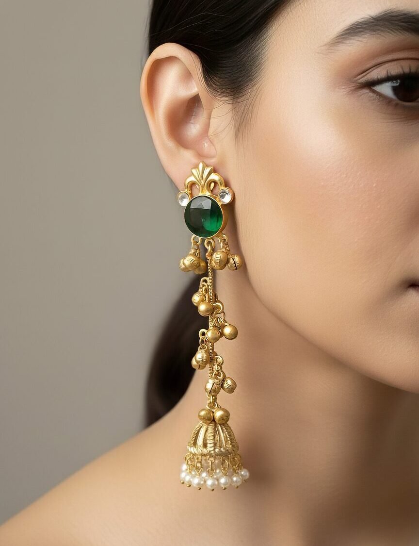 Gold Kundan Jhumka Earrings with Green Stones & Beaded Cascades