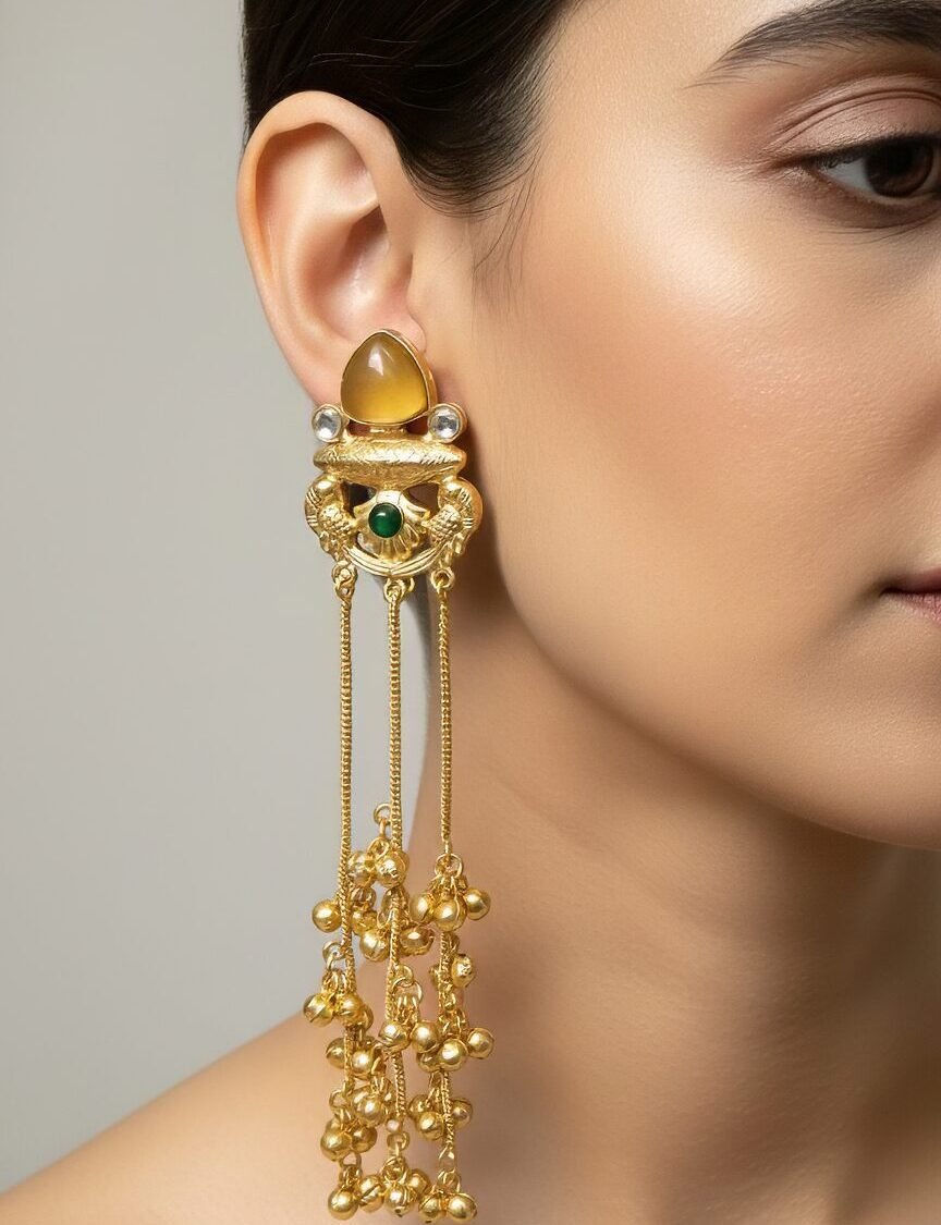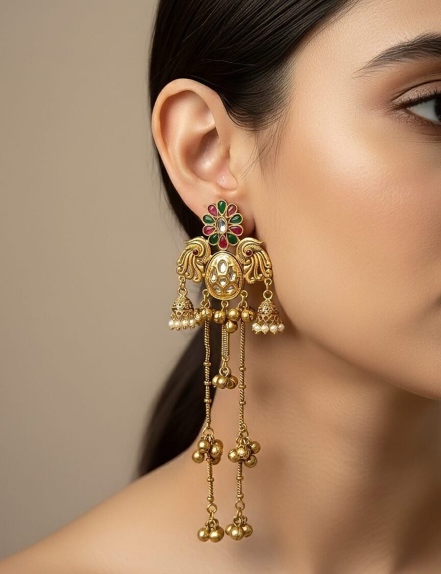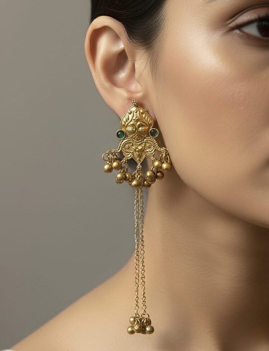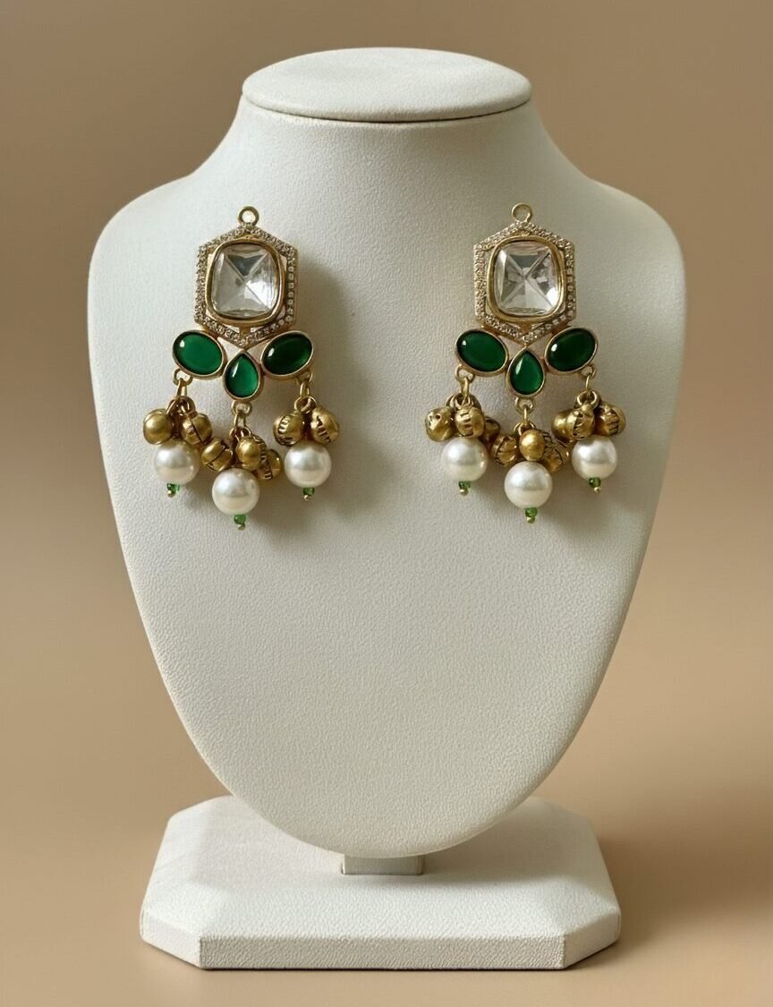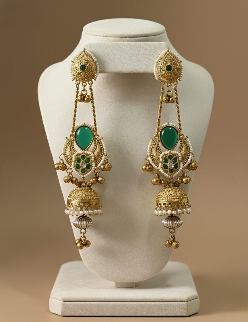 Gold Kundan Jhumka Earrings with Green Stones & Beaded Cascades