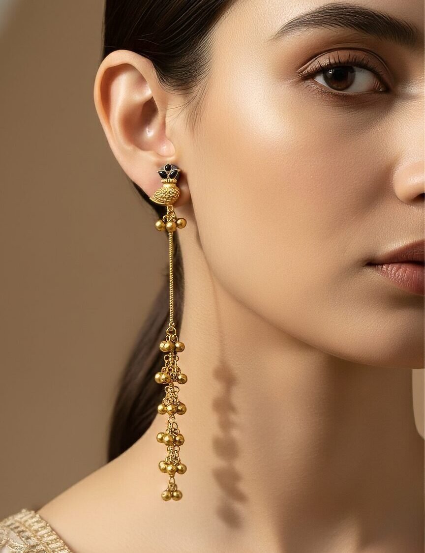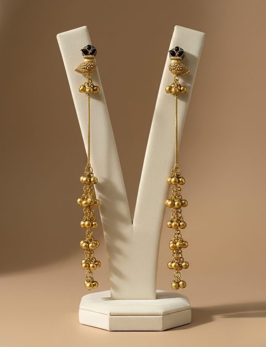 Gold Cascading Jhumka Earrings with Black & Gold Detailing