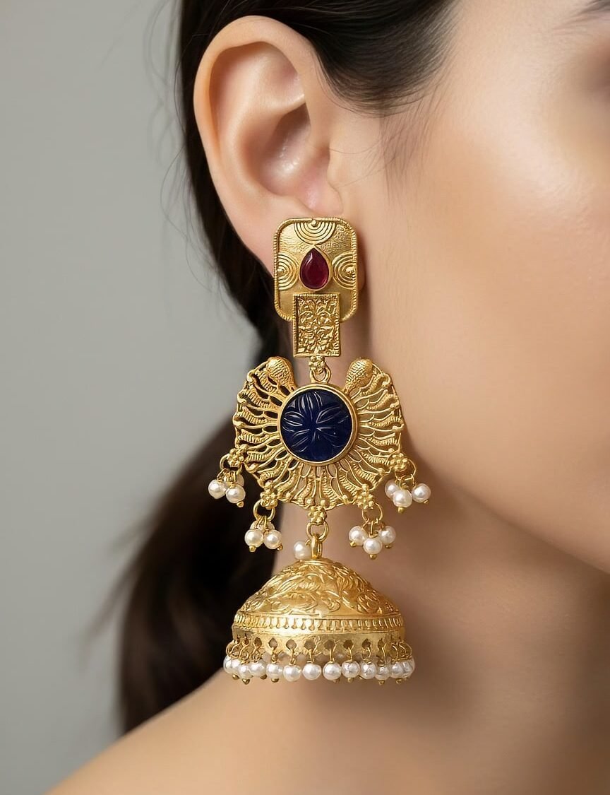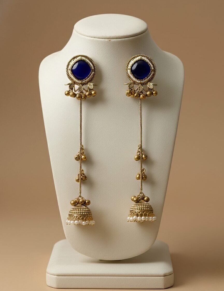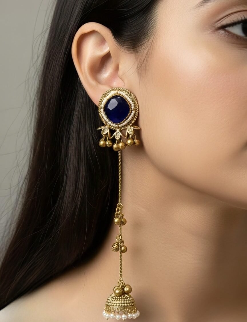 Gold Kundan Jhumka Earrings with Blue Studs & Pearl Fringe