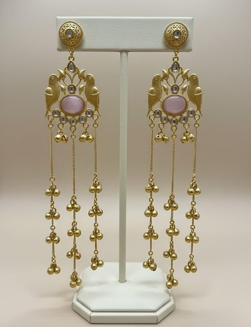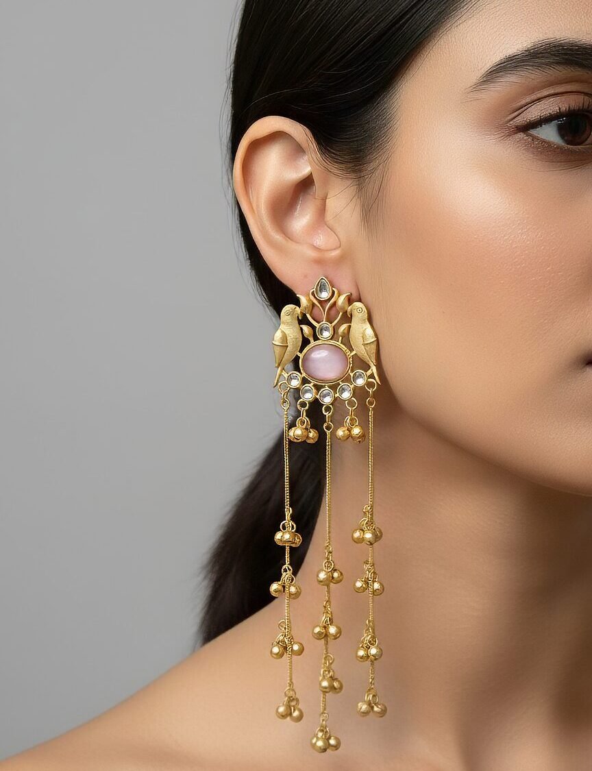 Gold Bird Motif Earrings with Pink Gemstone & Cascading Chains