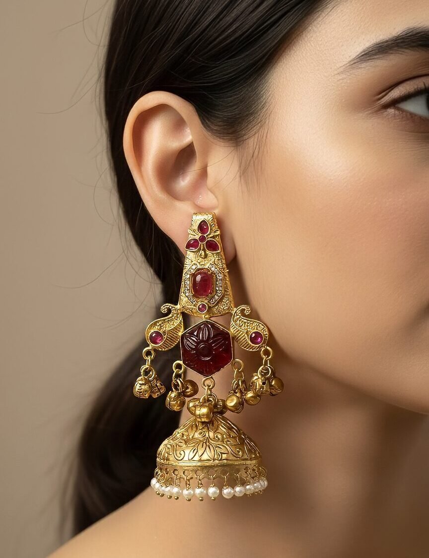 Gold Jhumka Earrings with Red Gemstones & Pearl Fringe