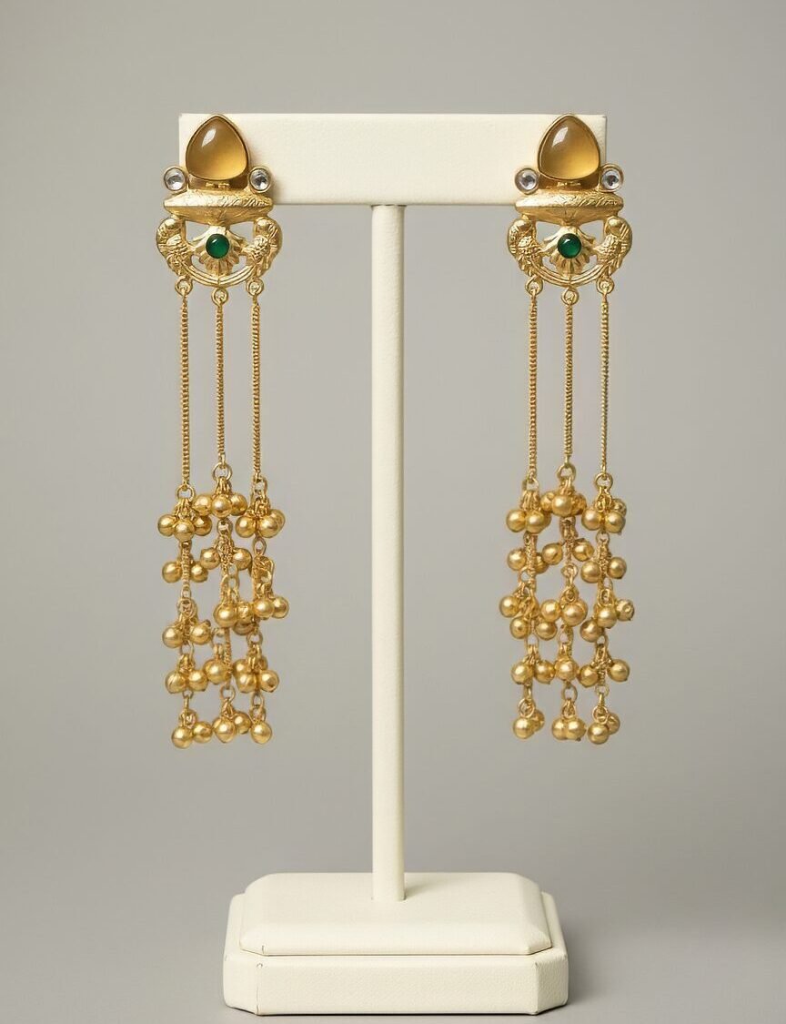 Gold Earrings with Green-Blue Stone & Cascading Beads
