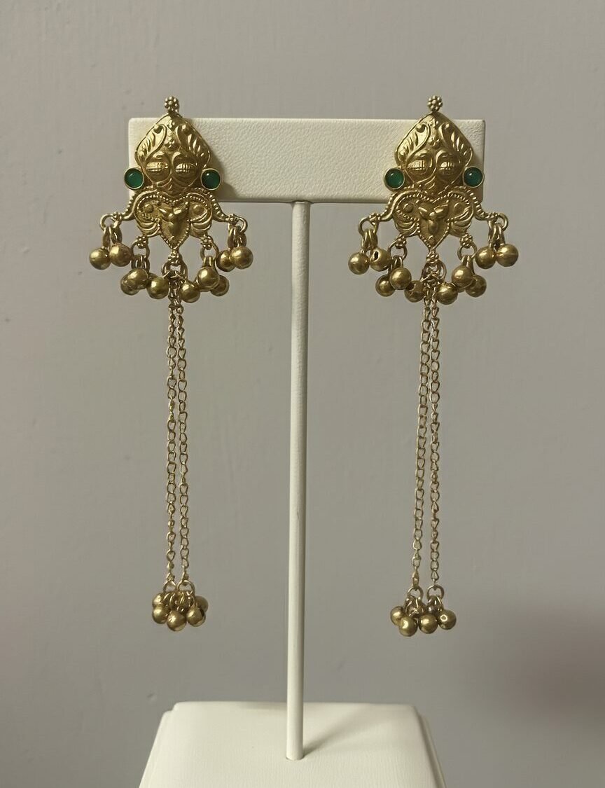 Gold Earrings with Green Gemstones & Cascading Bead Chains