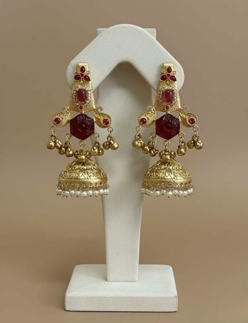 Gold Peacock Jhumka Earrings with Red & Green Gemstones