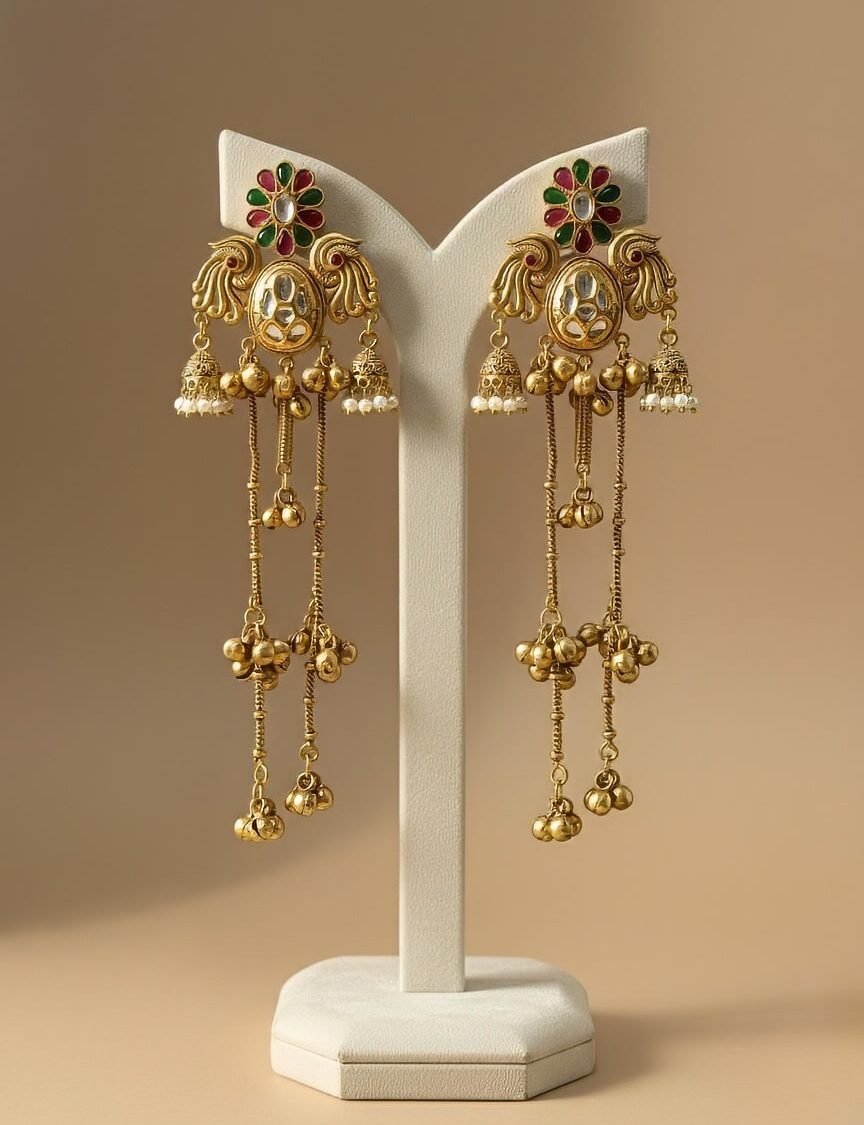 Gold Peacock Kundan Jhumka Earrings with Red & Green Stones