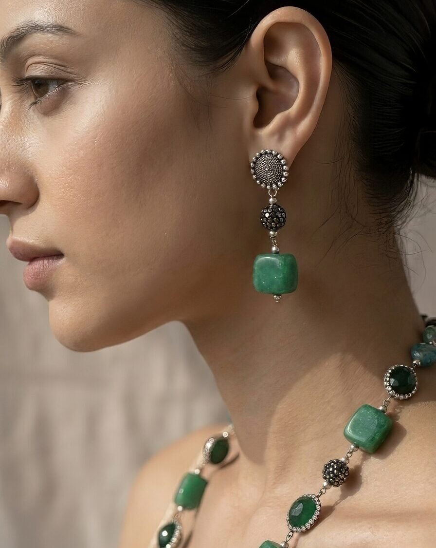 Gold Earrings with Green-Blue Stone & Cascading Beads