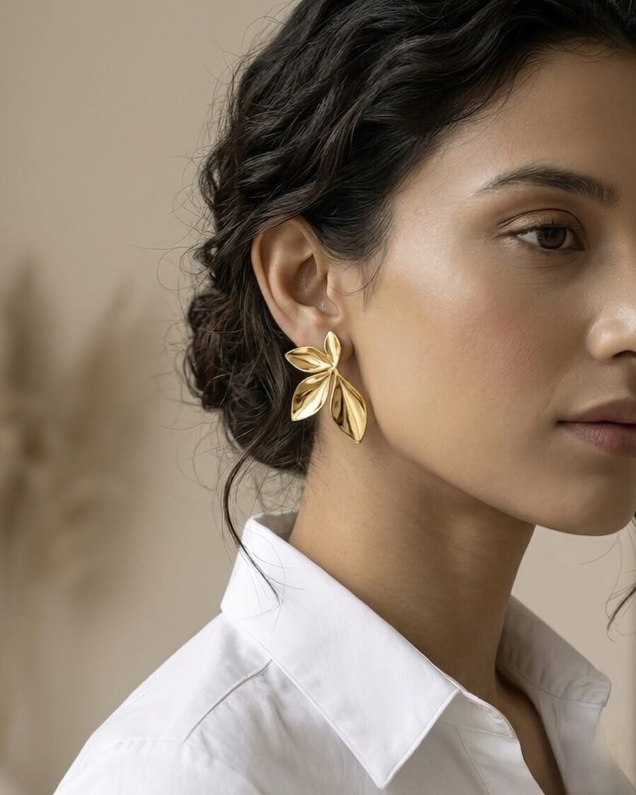 Gold Floral Earring & Double-Layer Necklace Set with Clear Gemstones