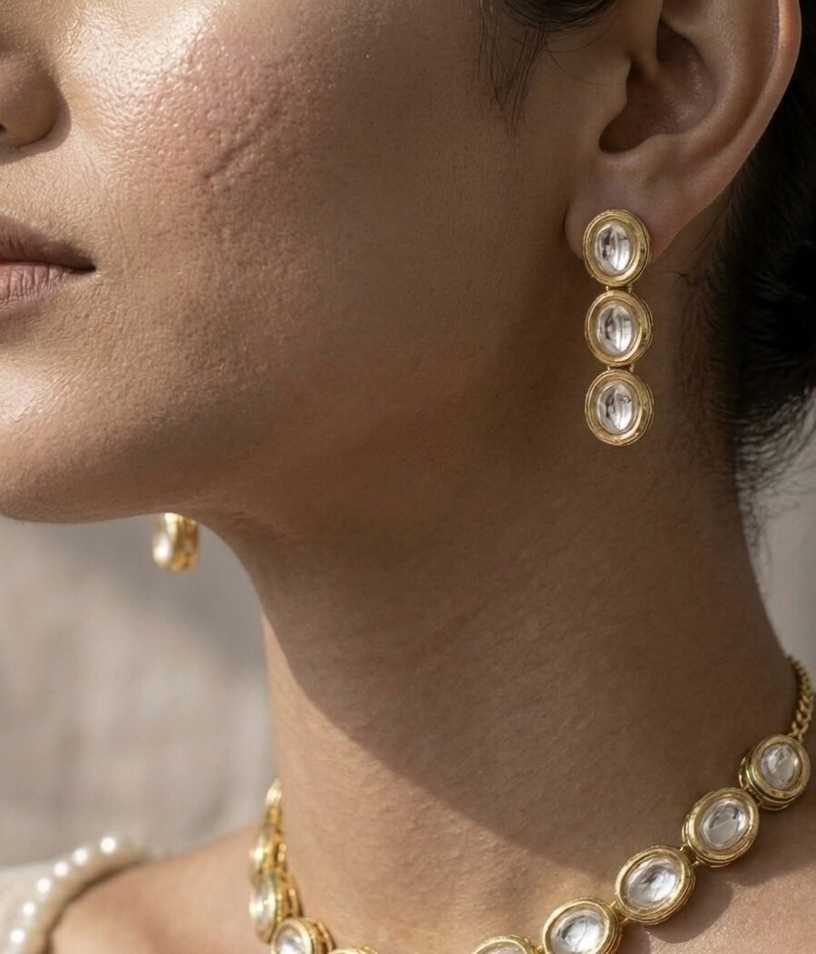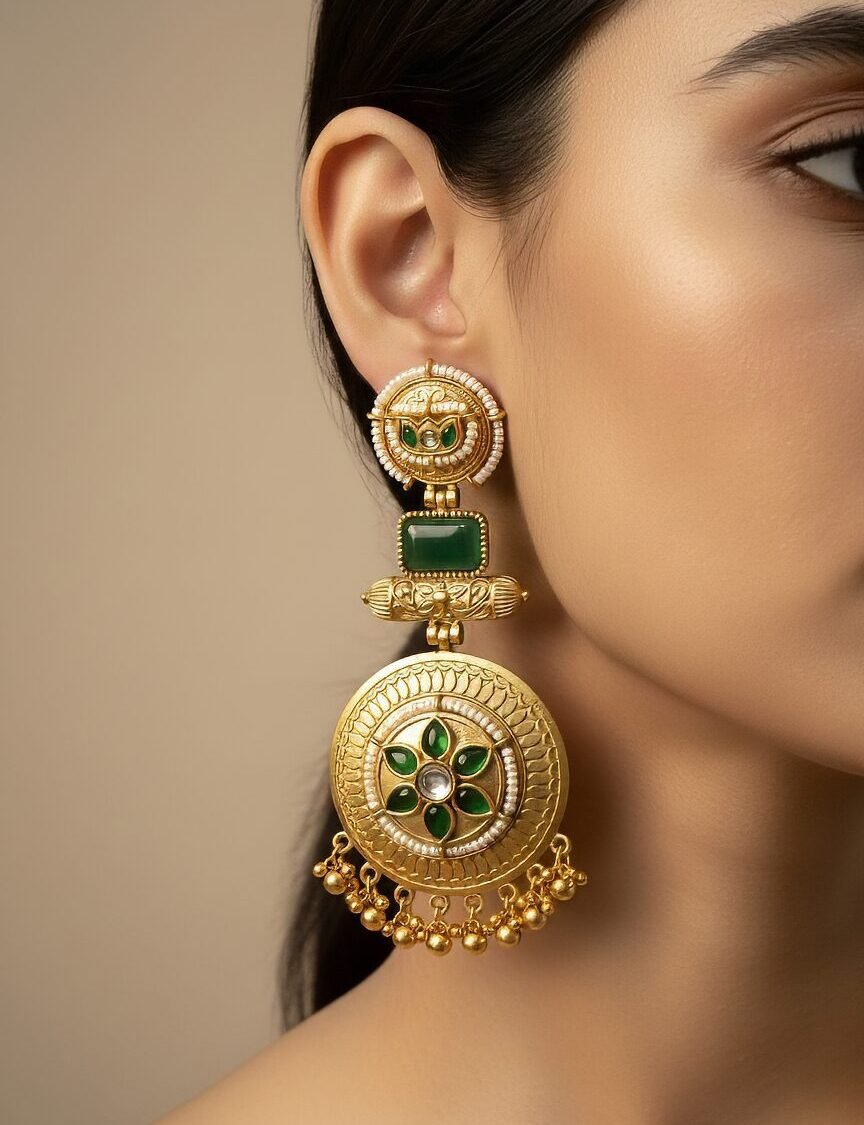 Gold Kundan Earrings with Green Stone Medallion & Pearl Fringe