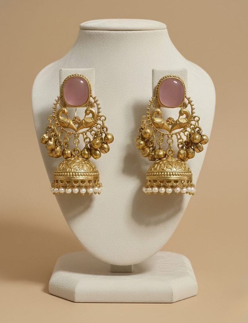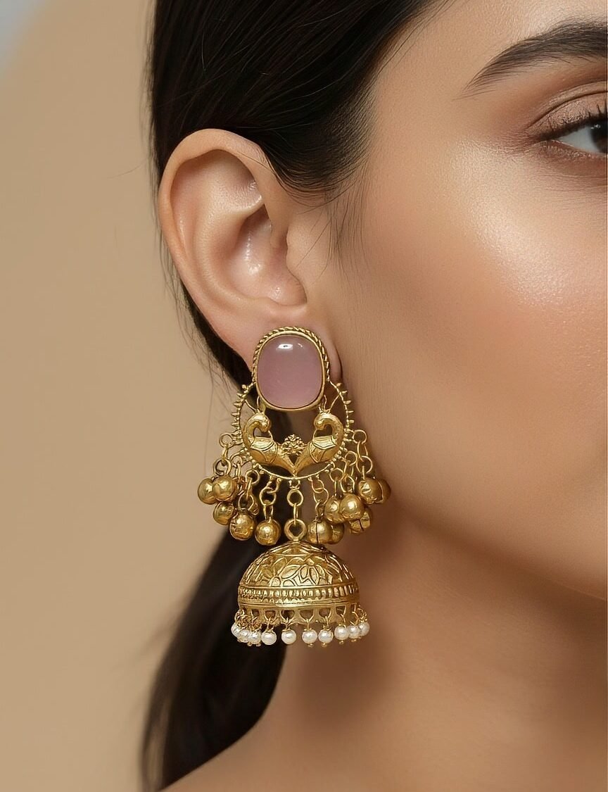 Gold Peacock Kundan Jhumka Earrings with Pink Stone & Pearl Fringe