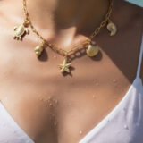 Each charm is delicately sculpted with fine detailing, offering a tactile and visual richness that complements the necklace’s sunlit gold finish. Worn against sun-kissed skin and a white garment, the piece radiates effortless beachside elegance.