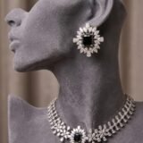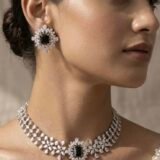 Designed in an elegant floral cluster silhouette, this premium choker set features a radiant arrangement of high-quality marquise and pear-cut stones, beautifully highlighted with a bold jet black emerald-cut centre stone. The matching statement earrings mirror the same luxurious floral motif, creating a refined and coordinated premium look.