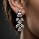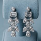 Designed in an elegant multi-shape drop silhouette, these statement earrings feature a striking arrangement of round, baguette, princess, and pear-cut high-quality stones, creating a balanced geometric cascade effect. The structured design adds depth, sparkle, and graceful movement, making them a perfect choice for refined evening styling.