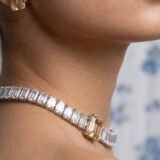 This exquisite choker is crafted with a seamless row of rectangle baguette-cut stones, beautifully arranged in a sleek collar silhouette that sits gracefully along the neckline. The elegant champagne-toned centre stone adds warmth, richness, and a refined focal point, perfectly complemented by matching champagne rectangle-cut stud earrings.