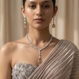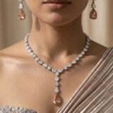 Its elegant champagne tone pairs beautifully with gowns, sarees, cocktail dresses, pastel lehengas, and western evening outfits, making it a timeless statement addition to your premium jewellery wardrobe.