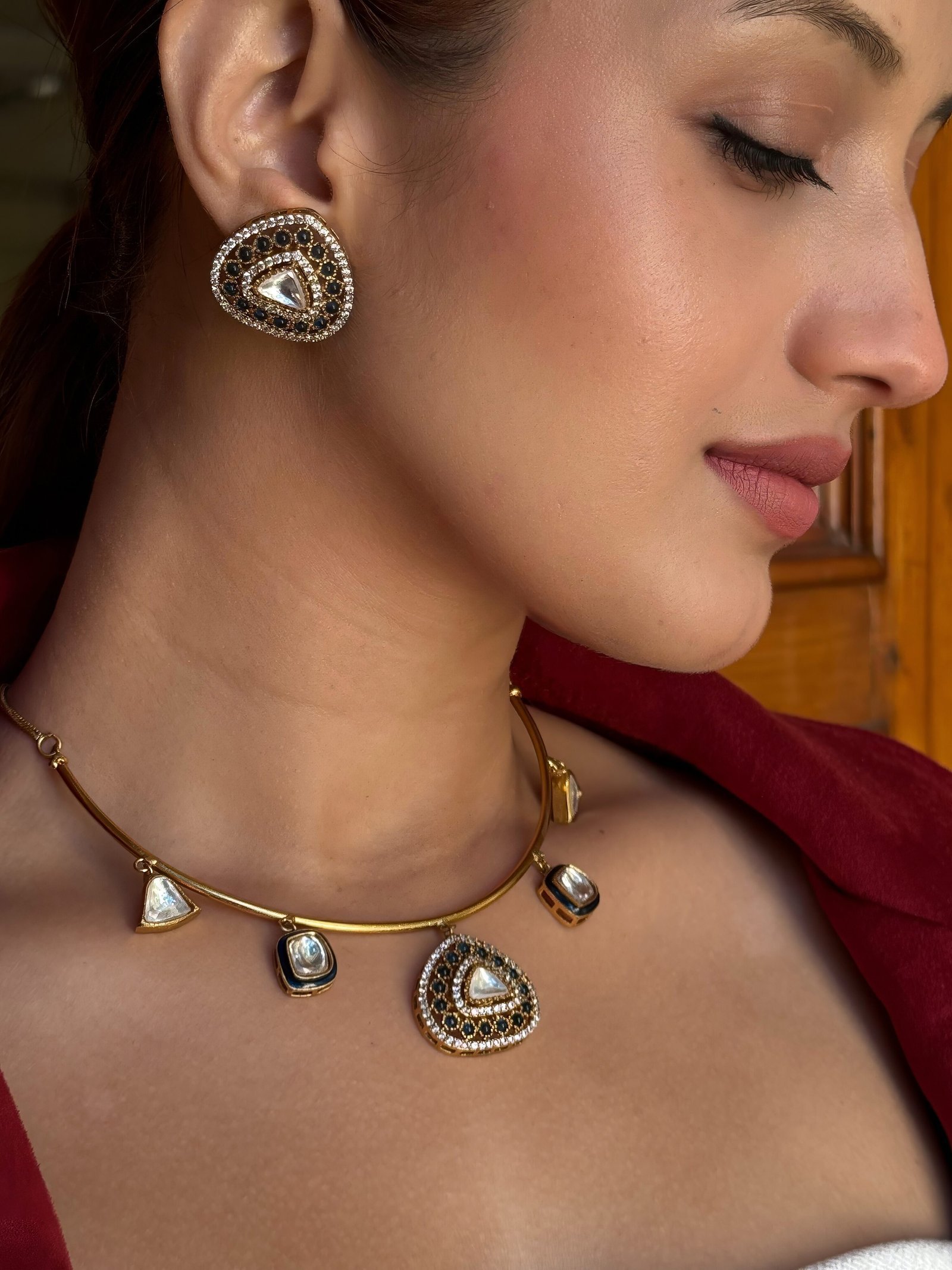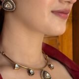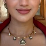 Discover the perfect blend of heritage and contemporary elegance with this gold-tone collar necklace, exquisitely adorned with Kundan stones and intricate black enamel work. Designed for those who love statement pieces with a refined aesthetic, this necklace is a masterpiece of craftsmanship.