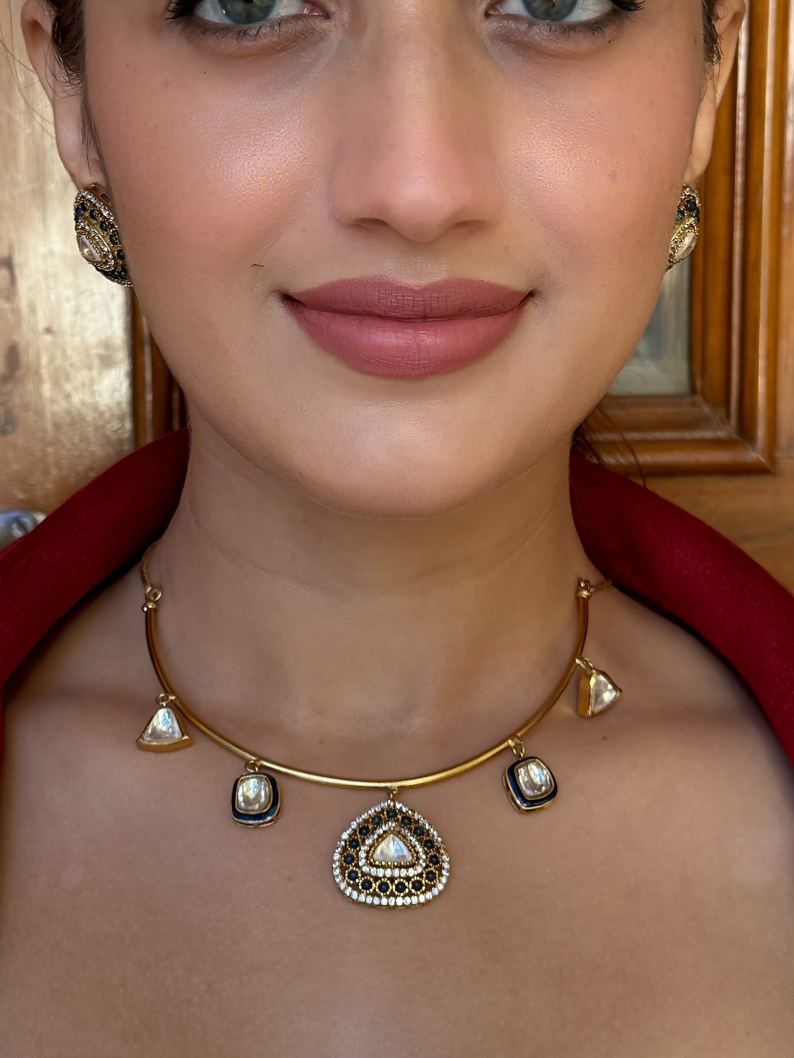 ✨ Design: Sleek gold collar with Kundan danglers and enamel detailing
