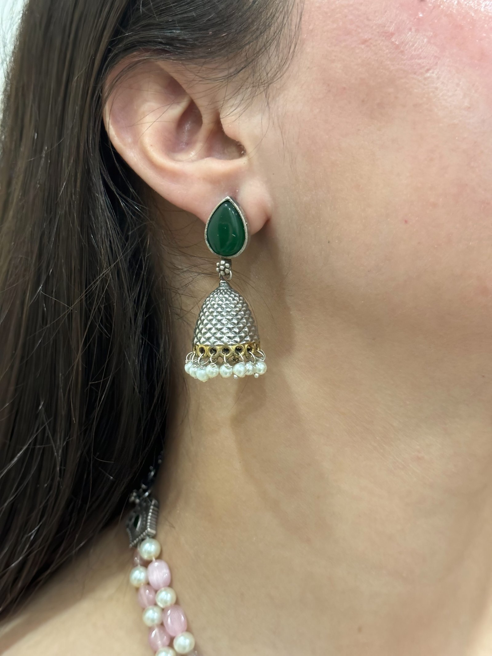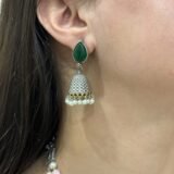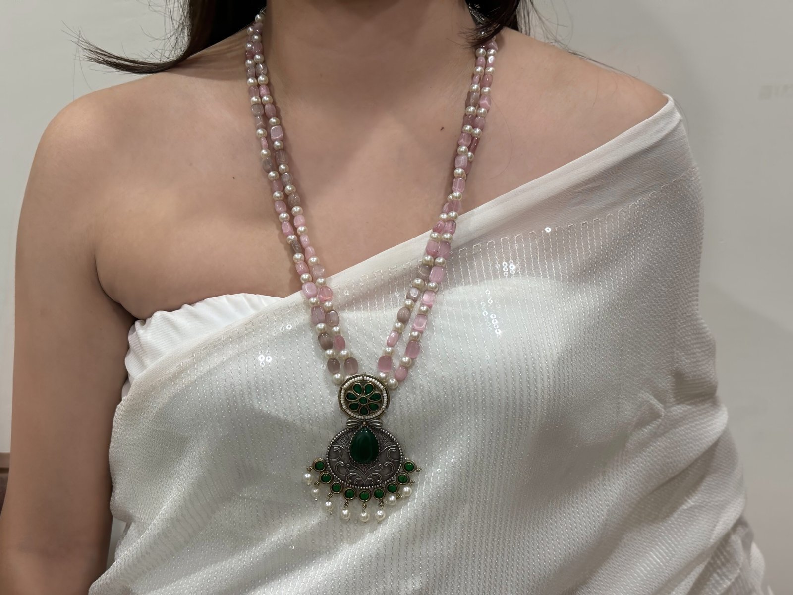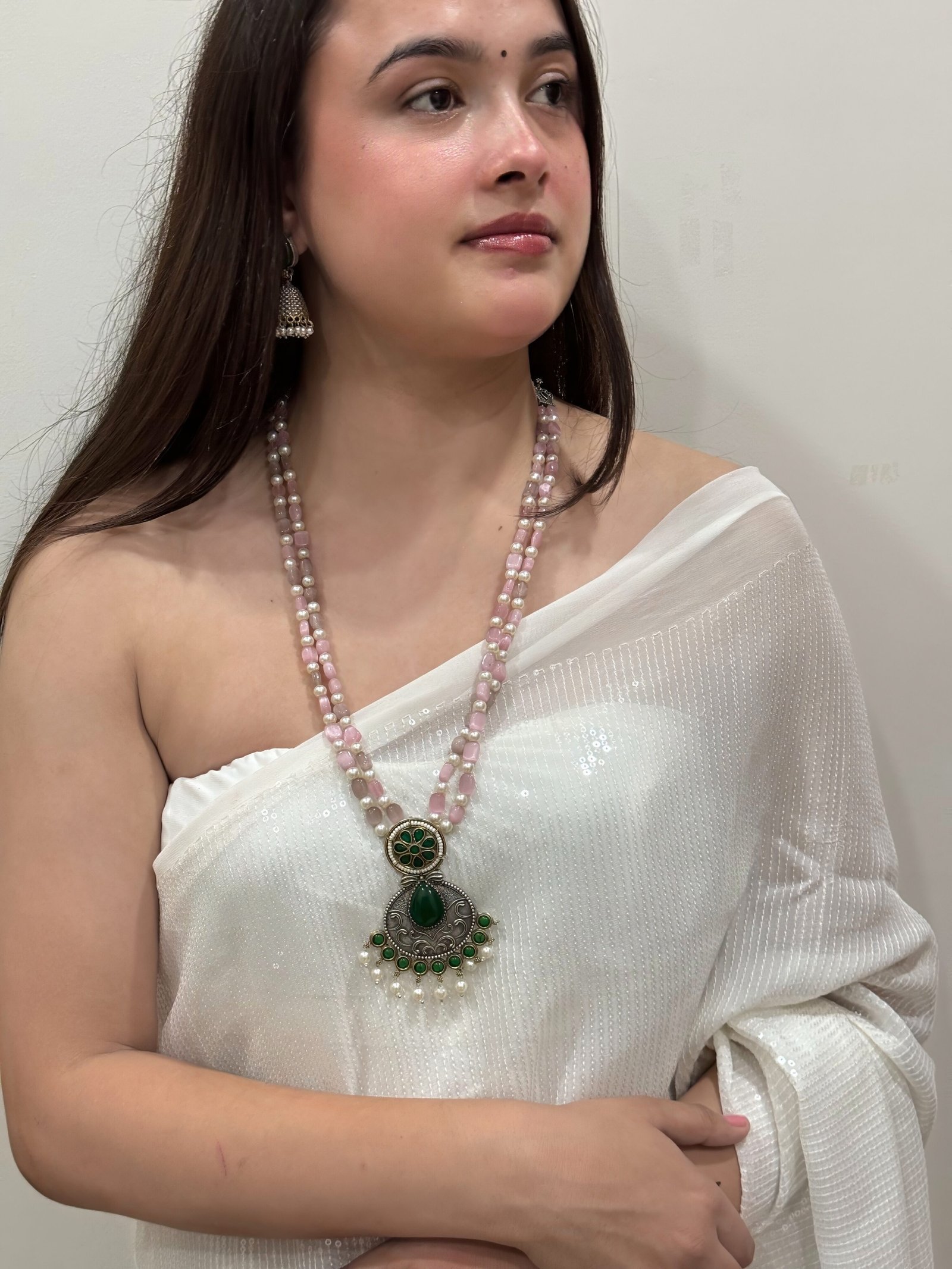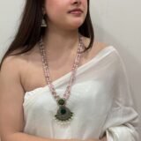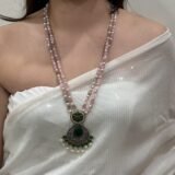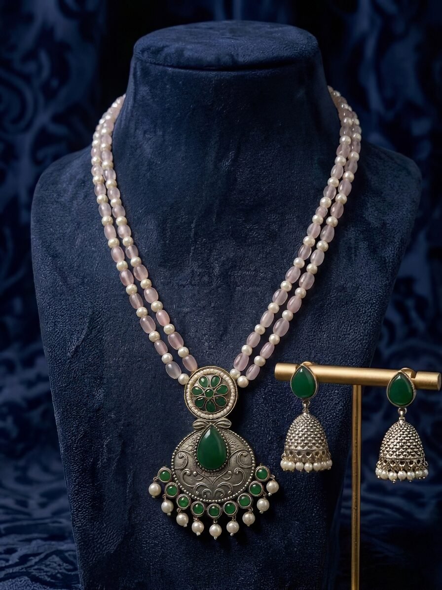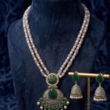 Step into timeless elegance with this stunning pink beaded necklace featuring a regal green enamel pendant and delicate pearl embellishments. Designed to exude sophistication, this handcrafted piece is perfect for elevating both traditional and modern outfits. The matching silver-toned jhumka earrings add the perfect finishing touch, making this set ideal for festive occasions and celebrations.