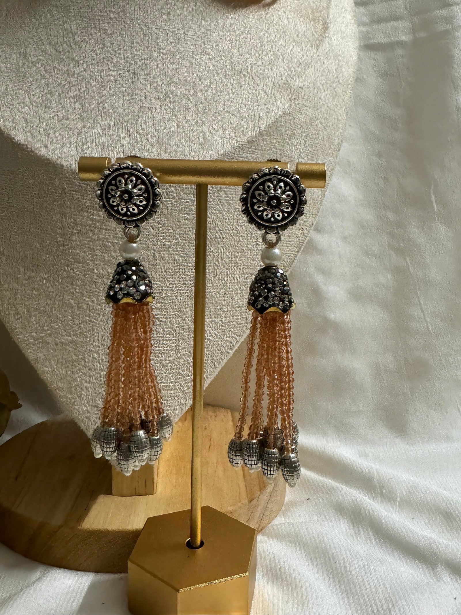 • Material: Oxidized silver, baroque pearls, peach beads, and pave-set embellishments