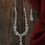This elegant jewelry set blends traditional artistry with structured symmetry, featuring a necklace and matching earring crafted in a polished alloy finish. The necklace showcases an alternating pattern of circular floral motifs and rectangular elements, each meticulously adorned with white stones. The circular segments display intricate floral detailing, while the rectangular units are bordered with clear stones and centered with green-hued gemstones, adding a subtle pop of color and contrast.