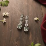 The matching earring mirrors the rectangular design, featuring a central green stone framed by white accents and topped with a floral motif for continuity. The overall composition is balanced and regal, making this set ideal for festive occasions, cultural events, or boutique styling.