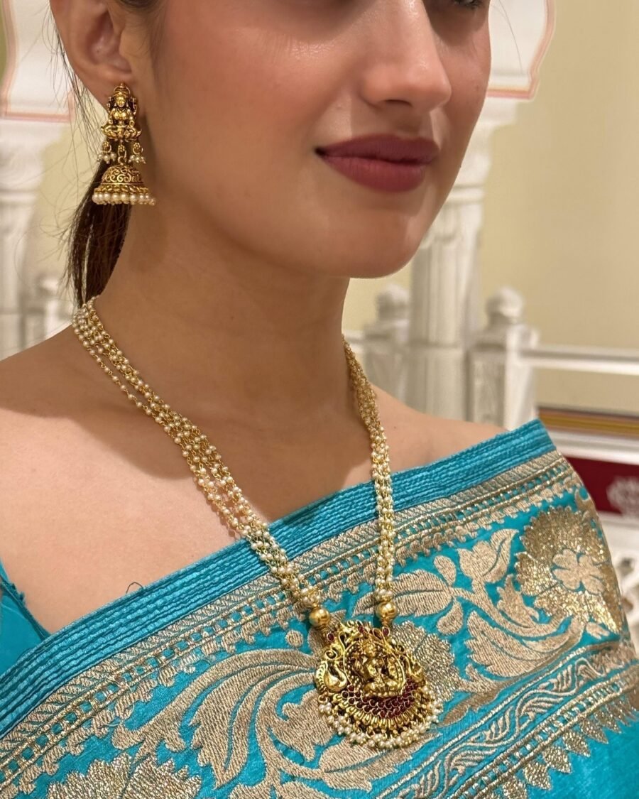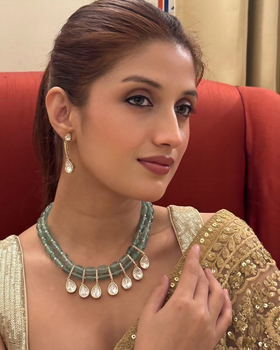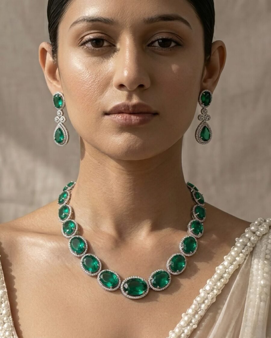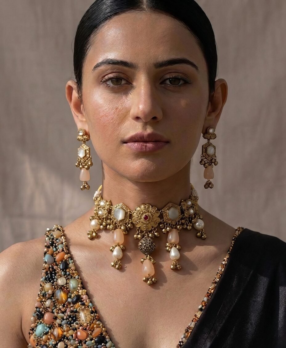 Perfect for weddings, festive occasions, and ceremonial gatherings, this set combines the brilliance of gemstones, the richness of gold, and the timeless charm of pearls—making it a statement piece that embodies both tradition and sophistication.
