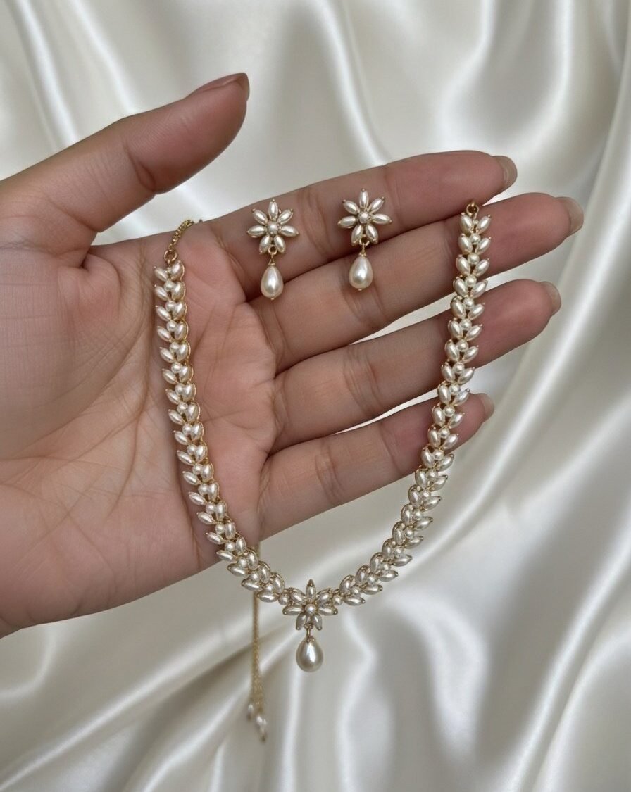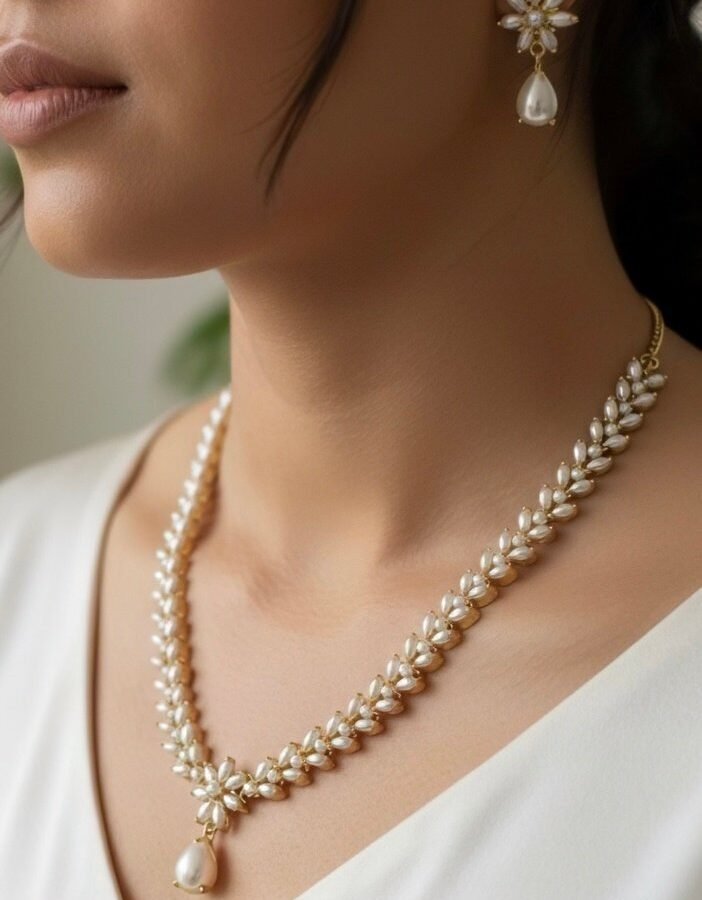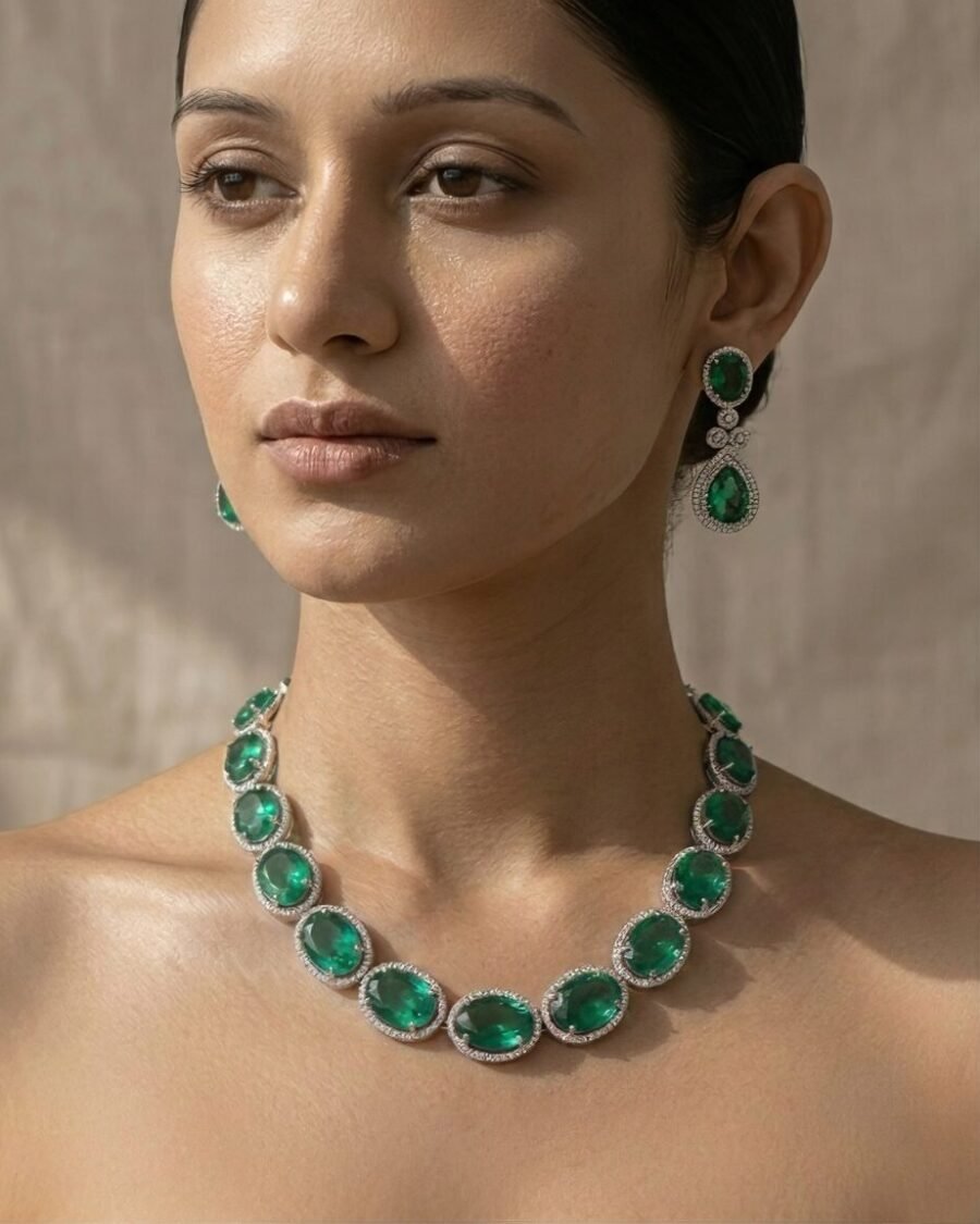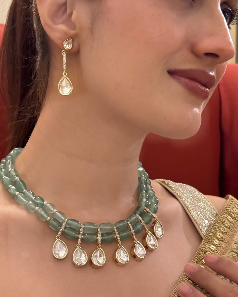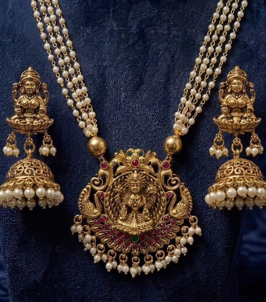 Perfect for weddings, festive occasions, and ceremonial gatherings, this set combines the brilliance of gemstones, the richness of gold, and the timeless charm of pearls—making it a statement piece that embodies both tradition and sophistication.