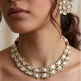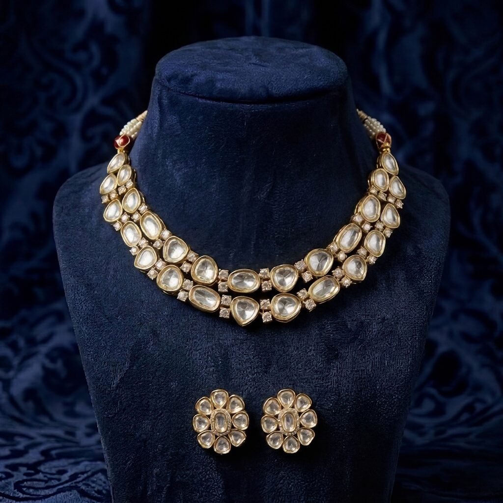 Complementing the earrings is a double-layered necklace, meticulously arranged with clear gemstones in symmetrical gold settings. The layered design enhances depth and brilliance, while the ornate detailing highlights both luxury and tradition.