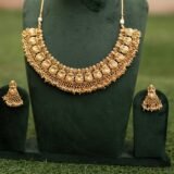 Introducing our captivating gold-plated choker set, a masterpiece adorned with intricate designs and embellishments. This exquisite choker showcases a series of Laxmi temple motifs, invoking a sense of tradition and grace with every wear. Paired with the choker are elegantly crafted jhumkis, featuring matching Laxmi motifs on their upper sections, infusing your ensemble with a divine charm. Meticulously crafted with attention to detail, this set exudes timeless elegance and traditional beauty, making it the perfect choice to add a regal touch to any occasion.