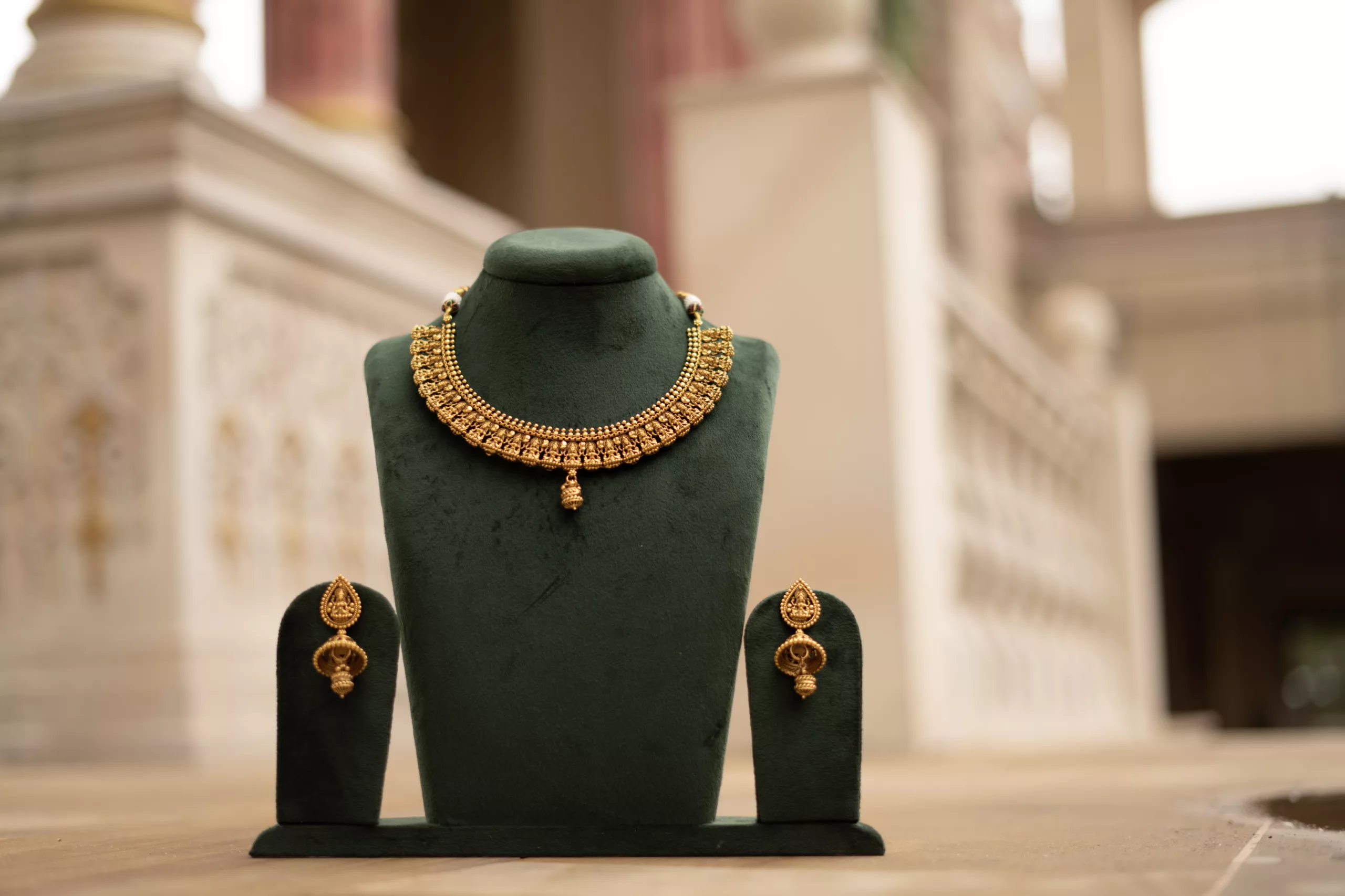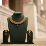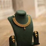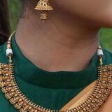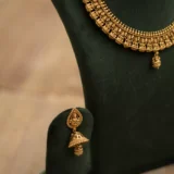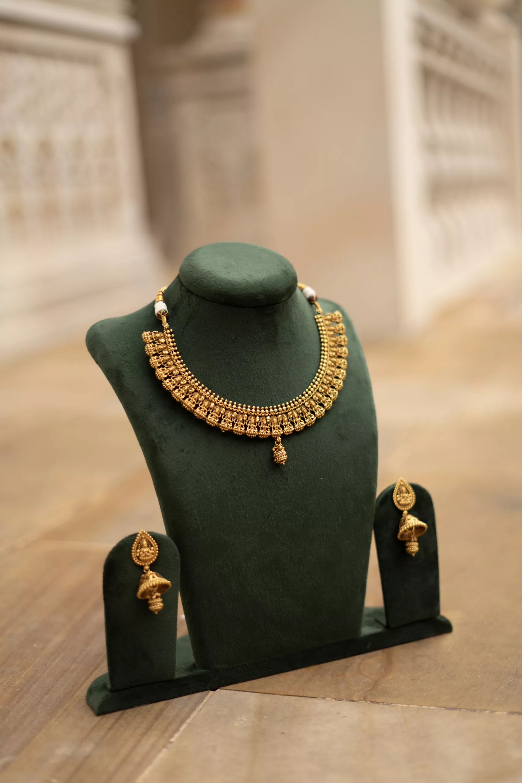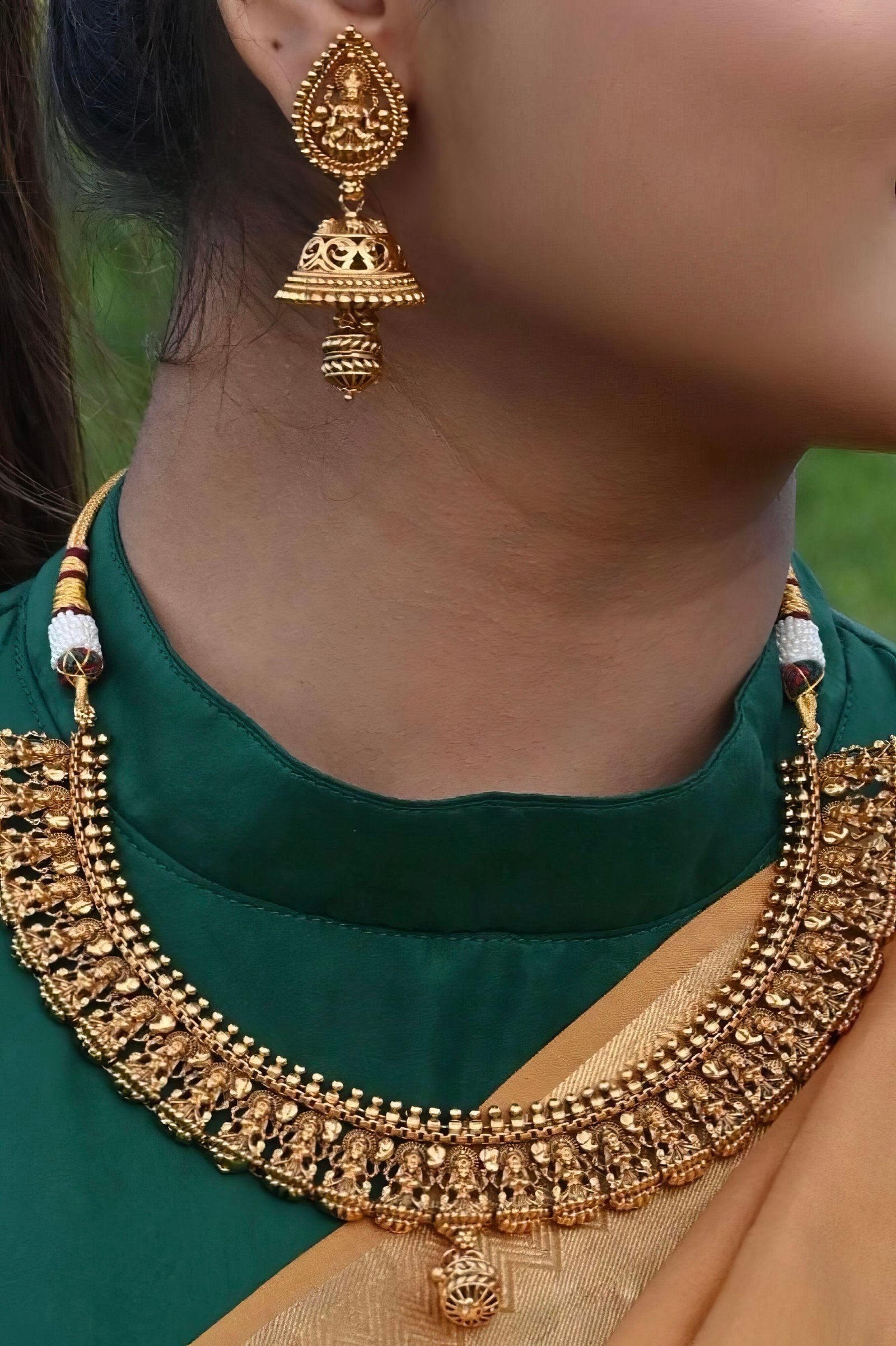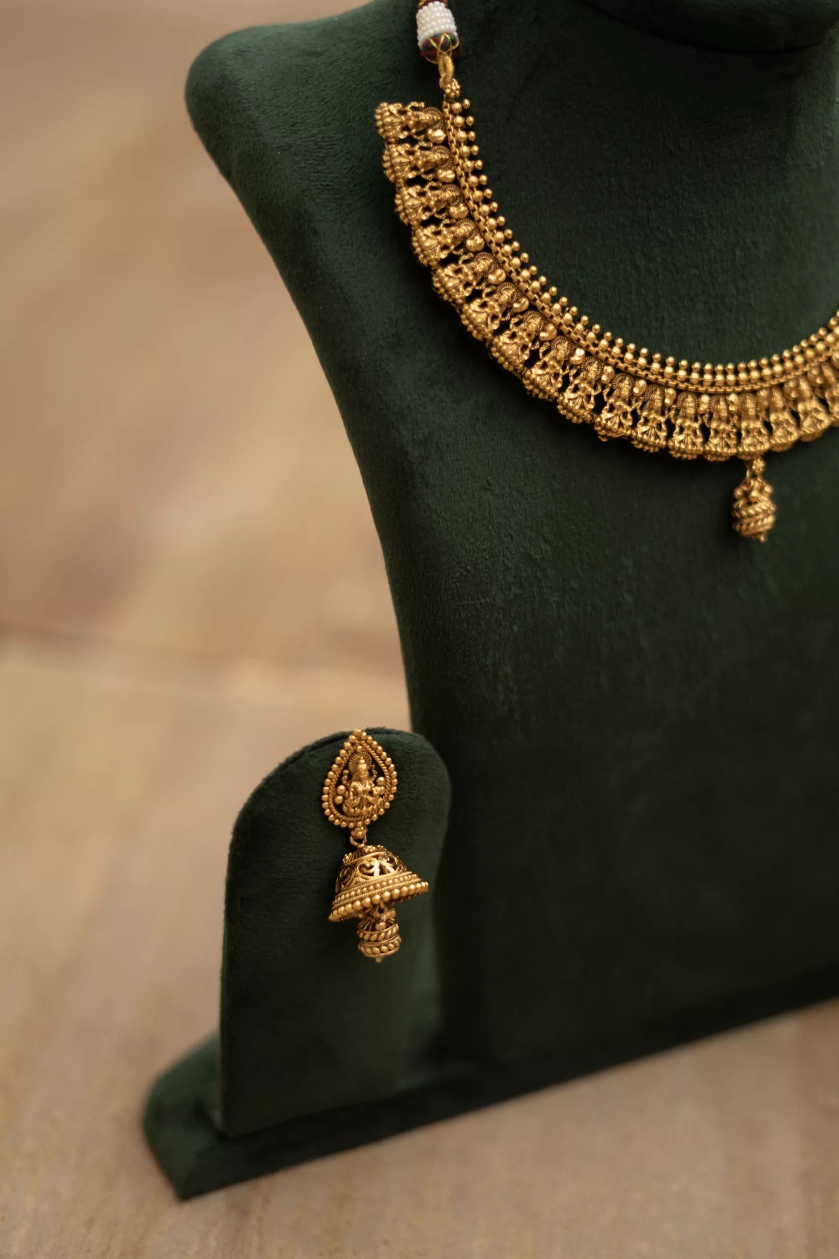 The necklace features intricate designs of Laxmi, the Hindu goddess of wealth and prosperity, interwoven with jhumkis, small bells commonly used in traditional Indian jewelry. The fusion of these elements creates a beautiful and intricate pattern, symbolizing abundance and grace. With its traditional yet elegant design, this necklace is a timeless adornment that exudes cultural richness and sophistication.