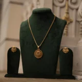 This gold pendant showcases an intricate design featuring Laxmi, the Hindu goddess of wealth and prosperity. The pendant is crafted with meticulous attention to detail, exhibiting finely detailed carvings that depict Laxmi in a traditional style.