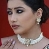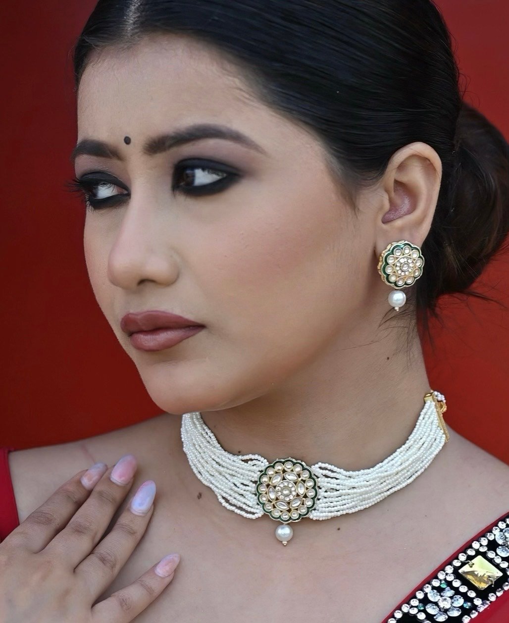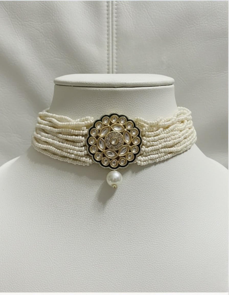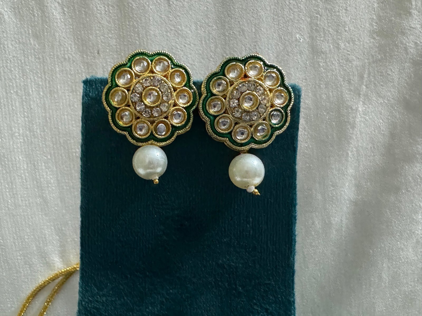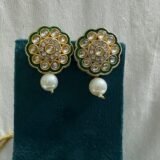 Introducing our necklace boasts a charming gold pendant adorned with pretty Kundan stones with green enamel, adding a touch of elegance and sophistication to your ensemble.