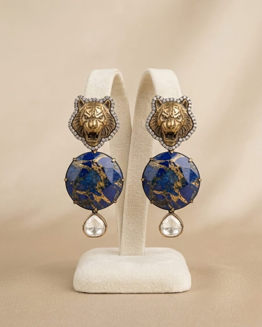 These earrings are not just accessories; they’re statements of boldness and regality. Crafted meticulously in gold, the striking tiger head design captures attention, while the large blue stone adds a touch of elegance and mystique.