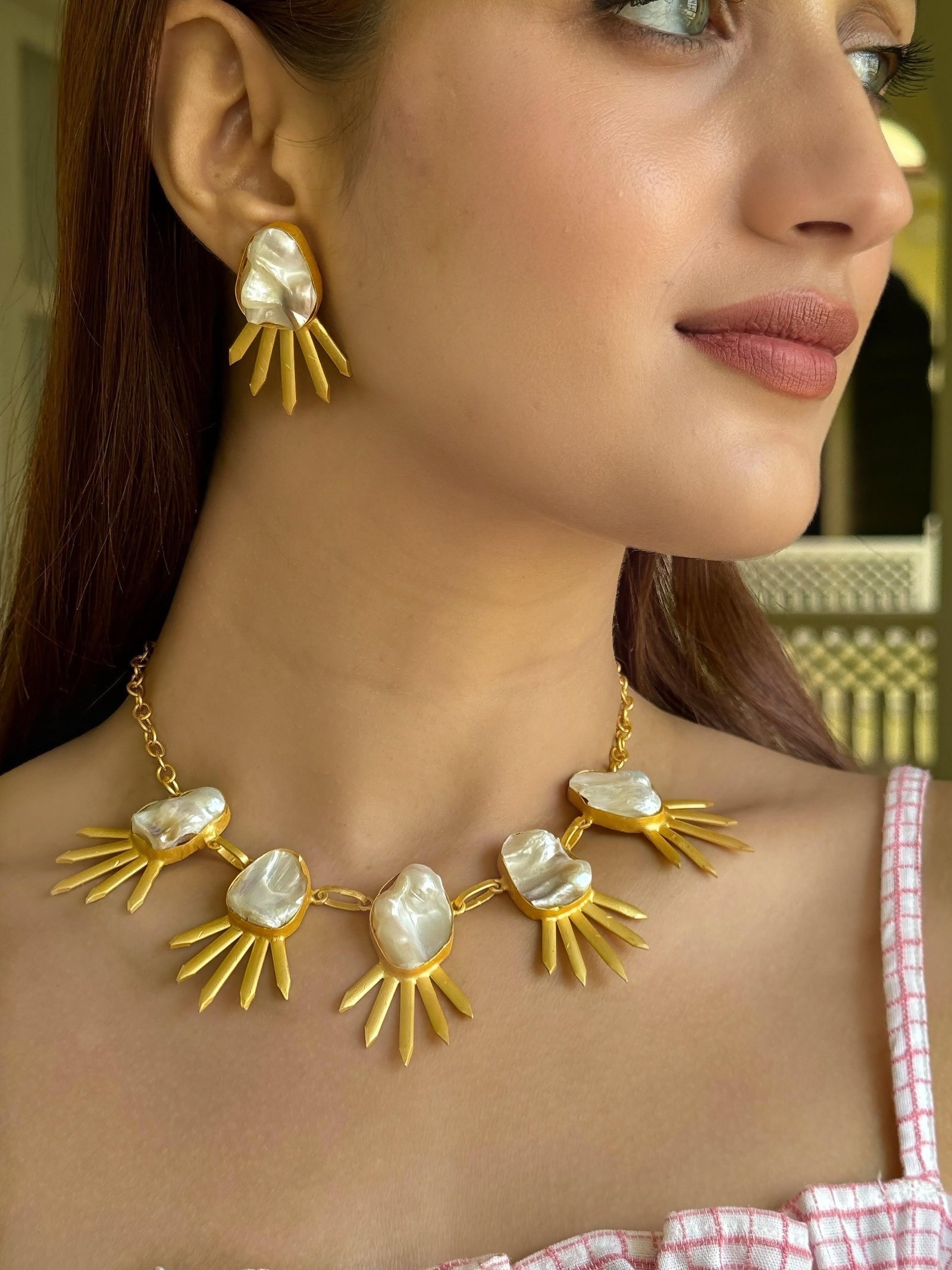 A striking necklace with unique baroque pearls, each surrounded by golden sunburst-inspired designs, making every piece one of a kind. - Matching Earrings:
