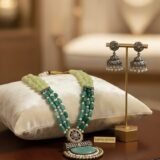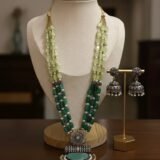 Indulge in the elegance of this exquisite dual-tone beaded necklace set, where tradition meets timeless craftsmanship. Featuring a luxurious blend of pastel green and rich emerald-hued beads, interwoven with delicate pearls, this necklace exudes regal sophistication.